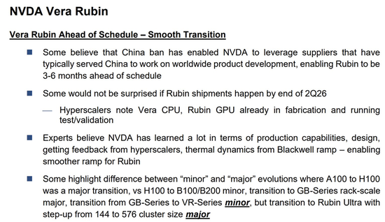 据华尔街见闻此前文章,Evercore的调研还指出了产品代际演进的差异,一些业内人士强调了“minor”(小幅演进)和“major”(大幅演进)之间的区别。其中从H100到B100/B200被视为minor过渡,而到GB-Series机架级系统是major演进,从GB-Series到VR-Series是minor,但到RubinUltra的过渡伴随着集群规模从144扩大到576则是major升级。
