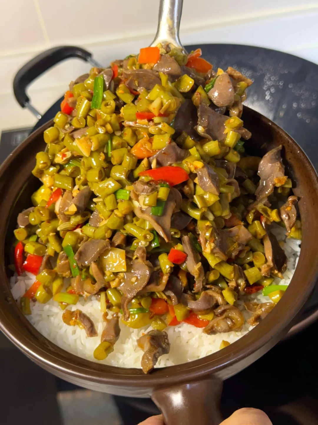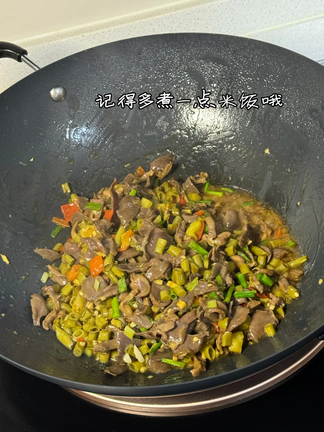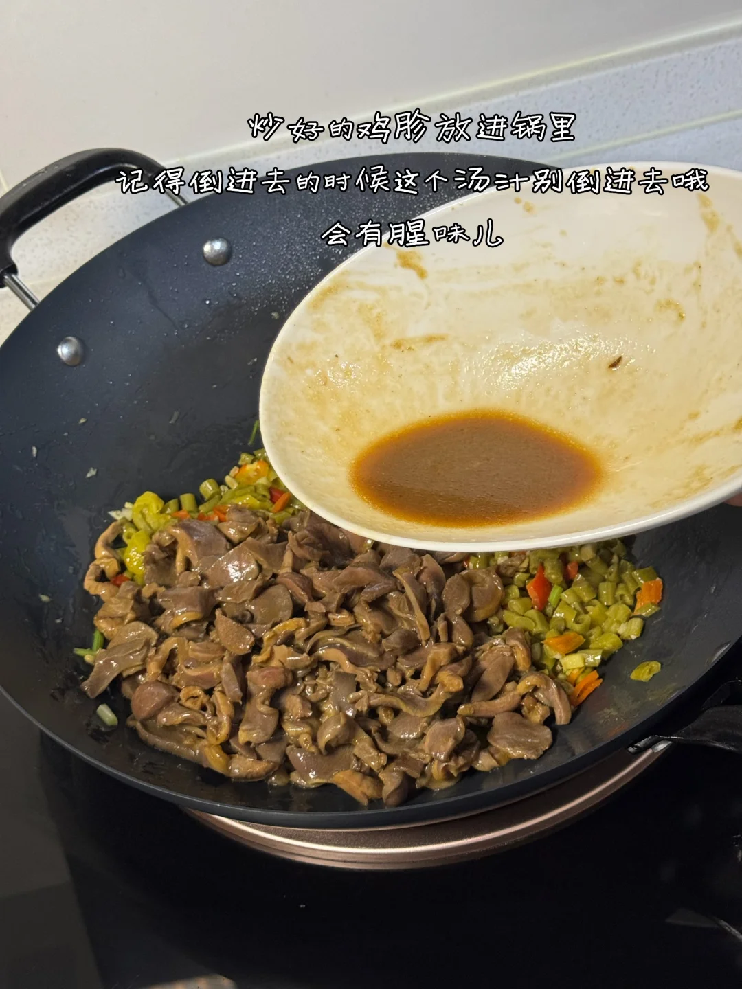6. 炒好的鸡胗放进锅里记得倒进去的时候这个汤汁别倒进去哦会有腥味儿
