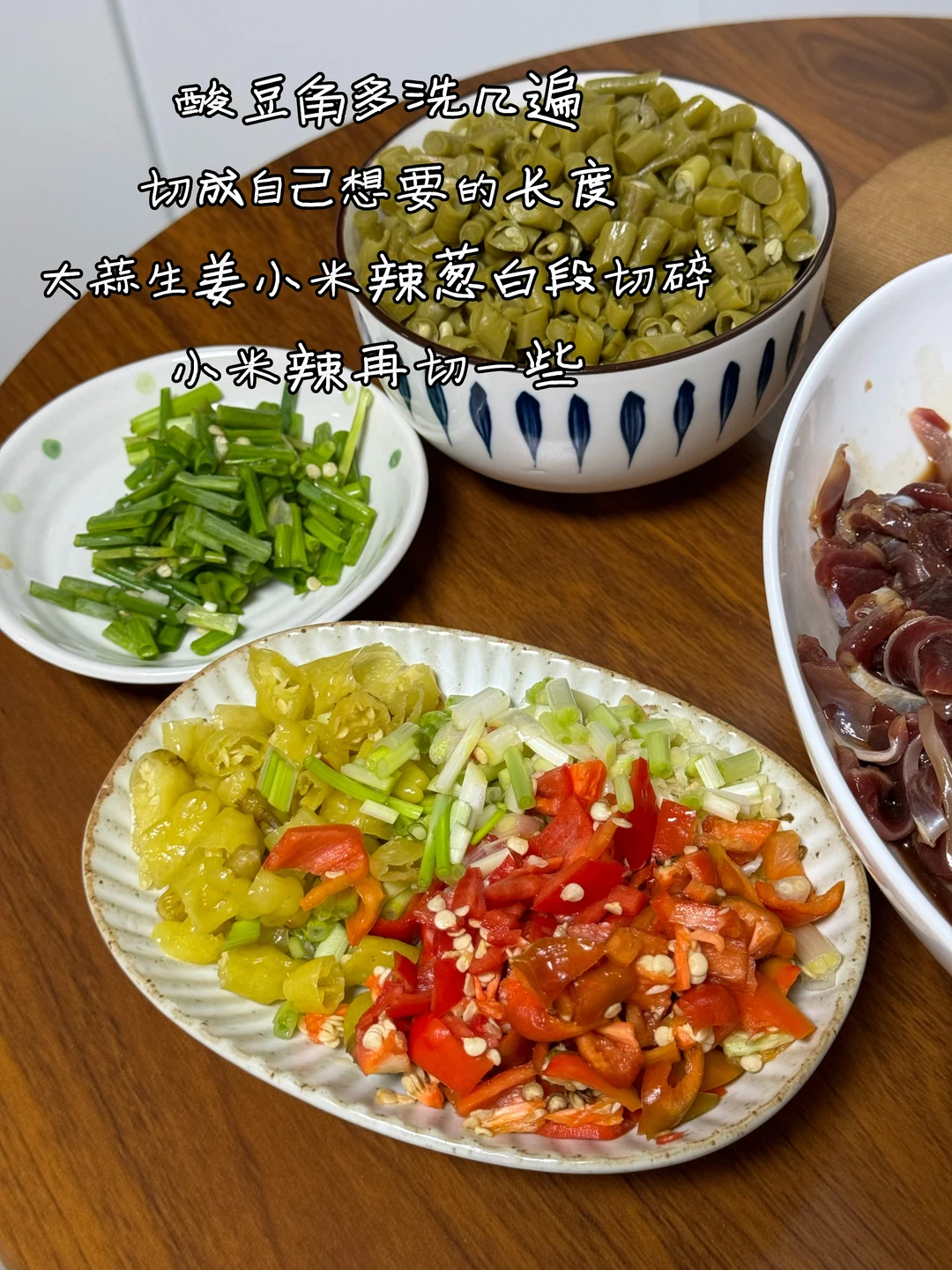 2. 酸豆角多洗几遍切成自己想要的长度大蒜生姜小米辣葱白段切碎小米辣再切一些