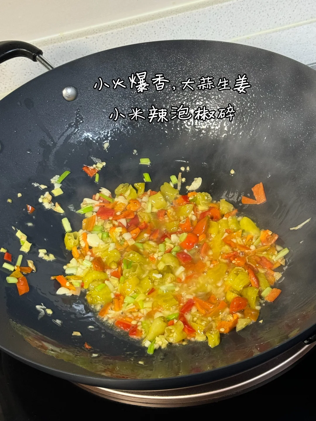 4. 小火爆香,大蒜生姜,小米辣泡椒碎