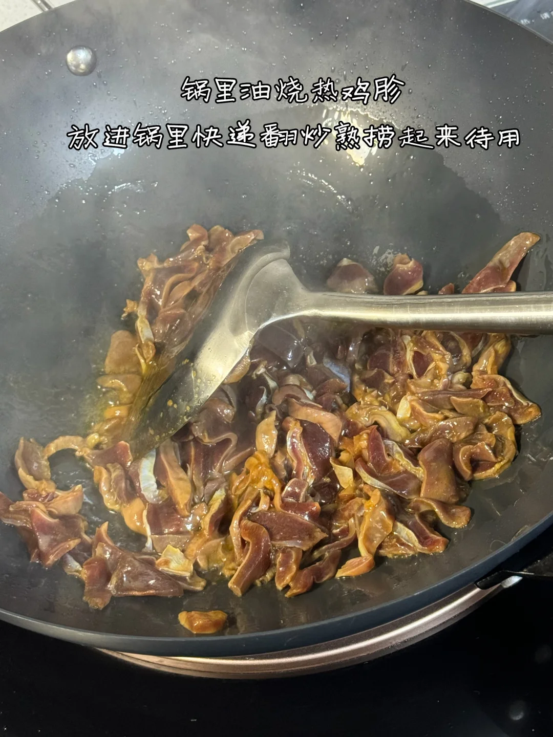 3. 锅里油烧热鸡胗放进锅里快递翻炒熟捞起来待用