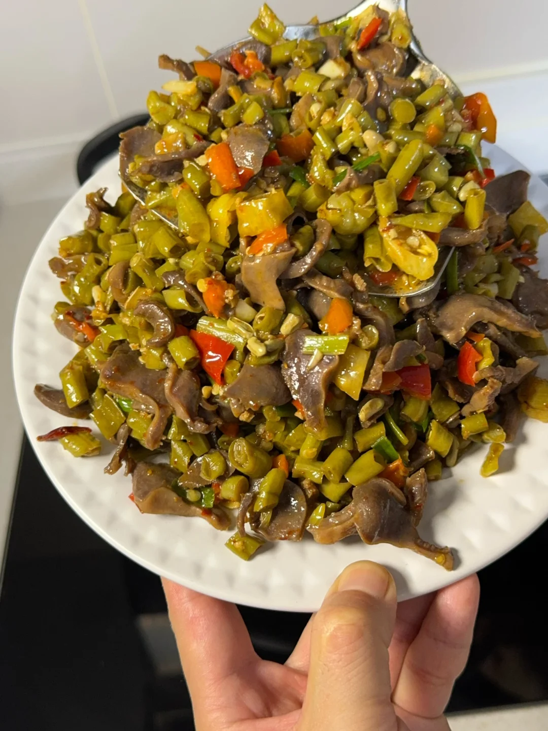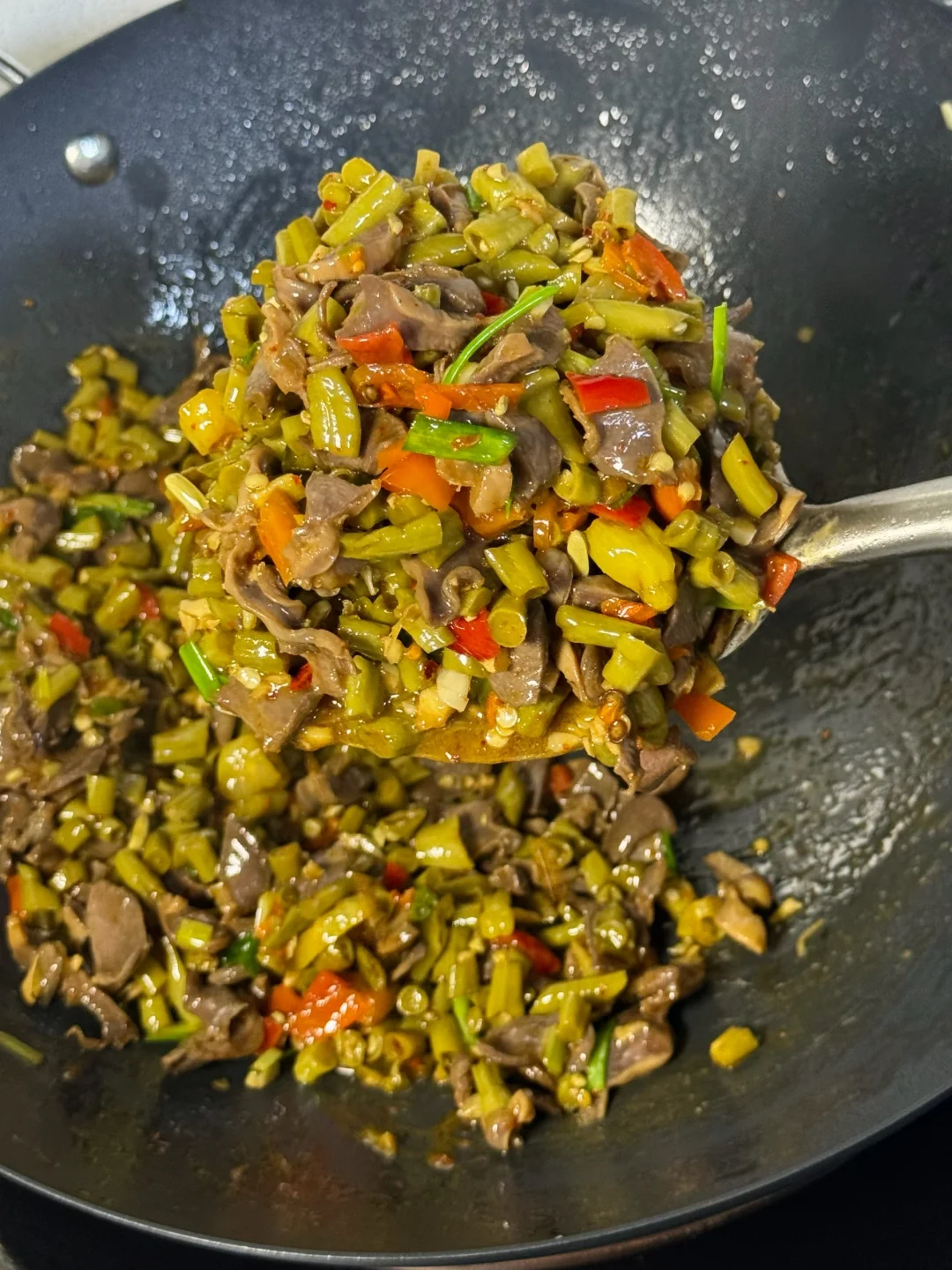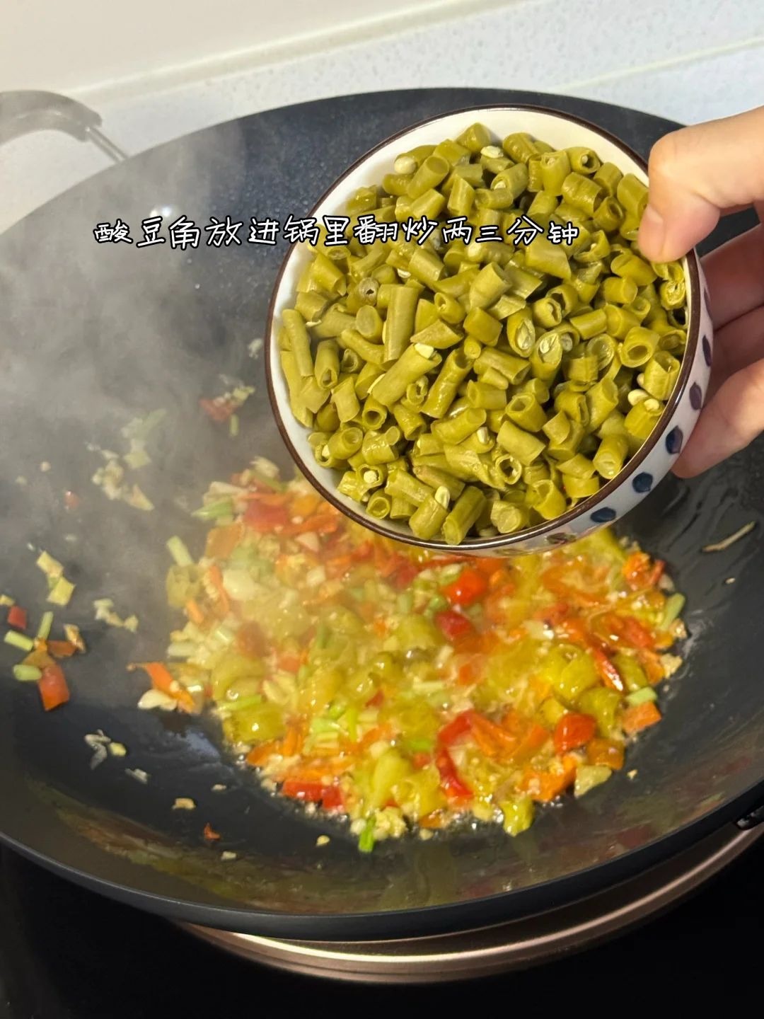 5. 酸豆角放进锅里翻炒两三分钟