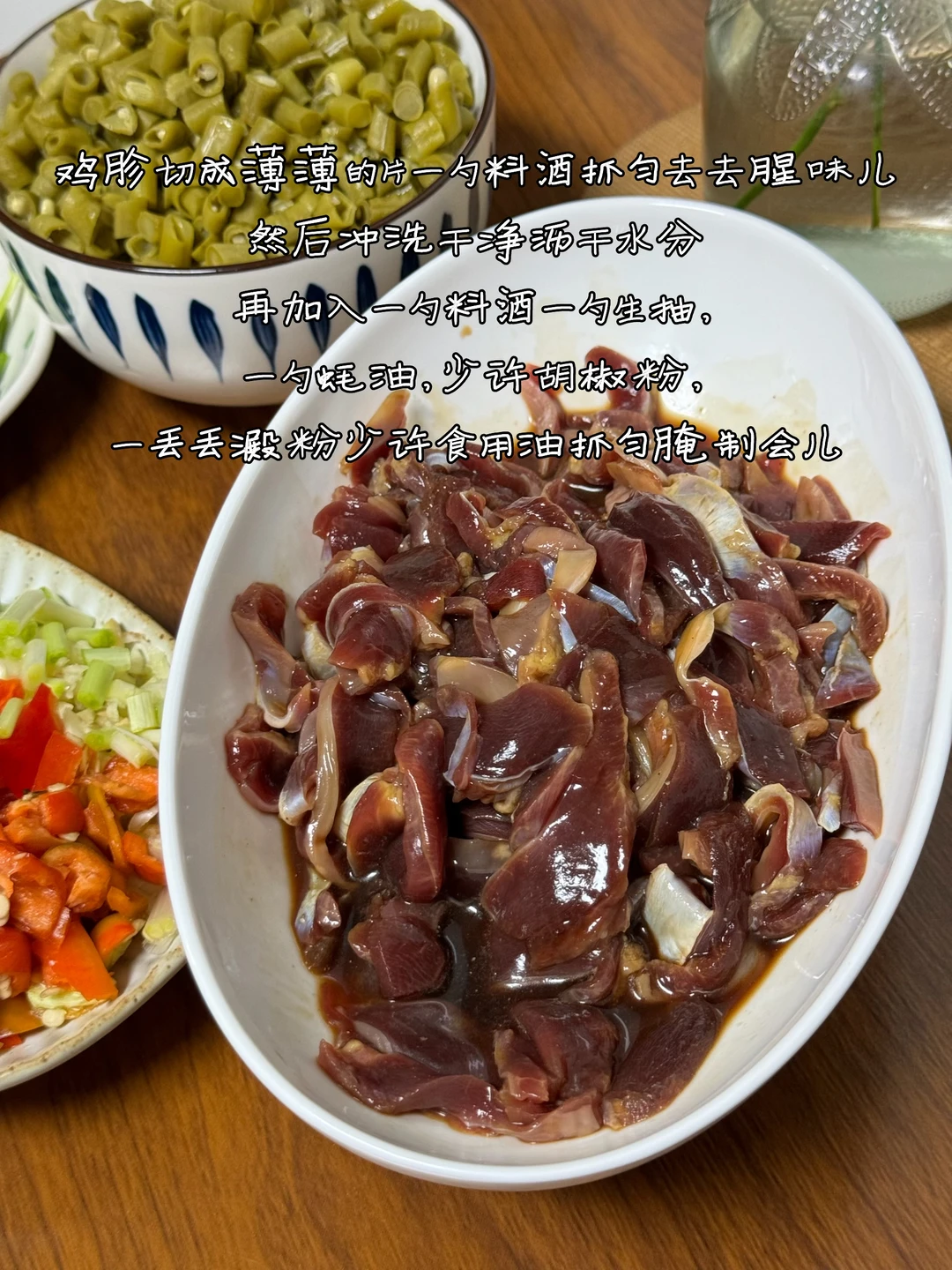 1. 鸡胗切成薄薄的片一勺料酒抓匀去去腥味儿,然后冲洗干净沥干水分再加入一勺料酒一勺生抽,一勺蚝油,少许胡椒粉,一丢丢淀粉少许食用油抓匀腌制会儿