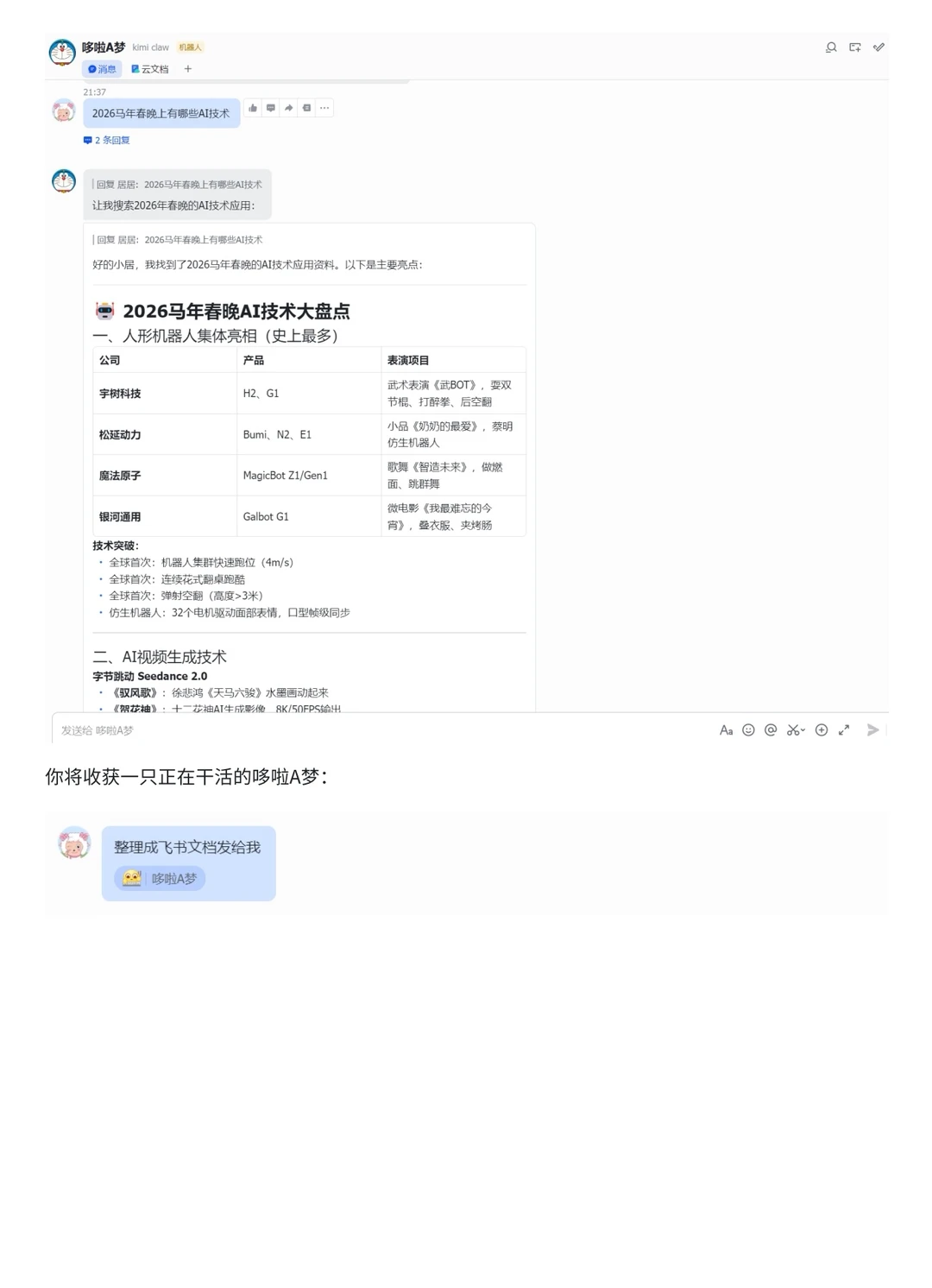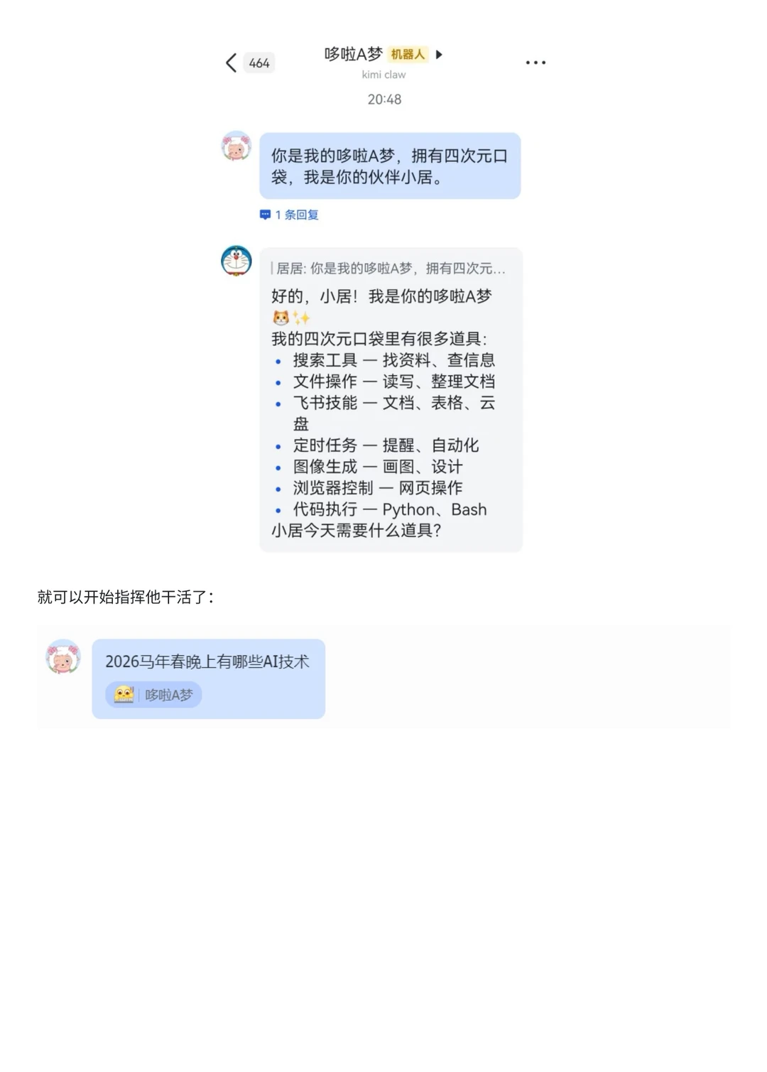 今天的教程,专门为非技术背景的朋友准备。Kimi 最近接入的 OpenClaw,就像把哆啦A梦的四次元口袋数字化了——不需要你会写代码,只需要会说话,打破传统终端工具的使用壁垒。哪怕是文科生,也能在 10分钟内,把它装进你的飞书里。就像哆啦A梦的四次元口袋,小巧却能解决各类难题。