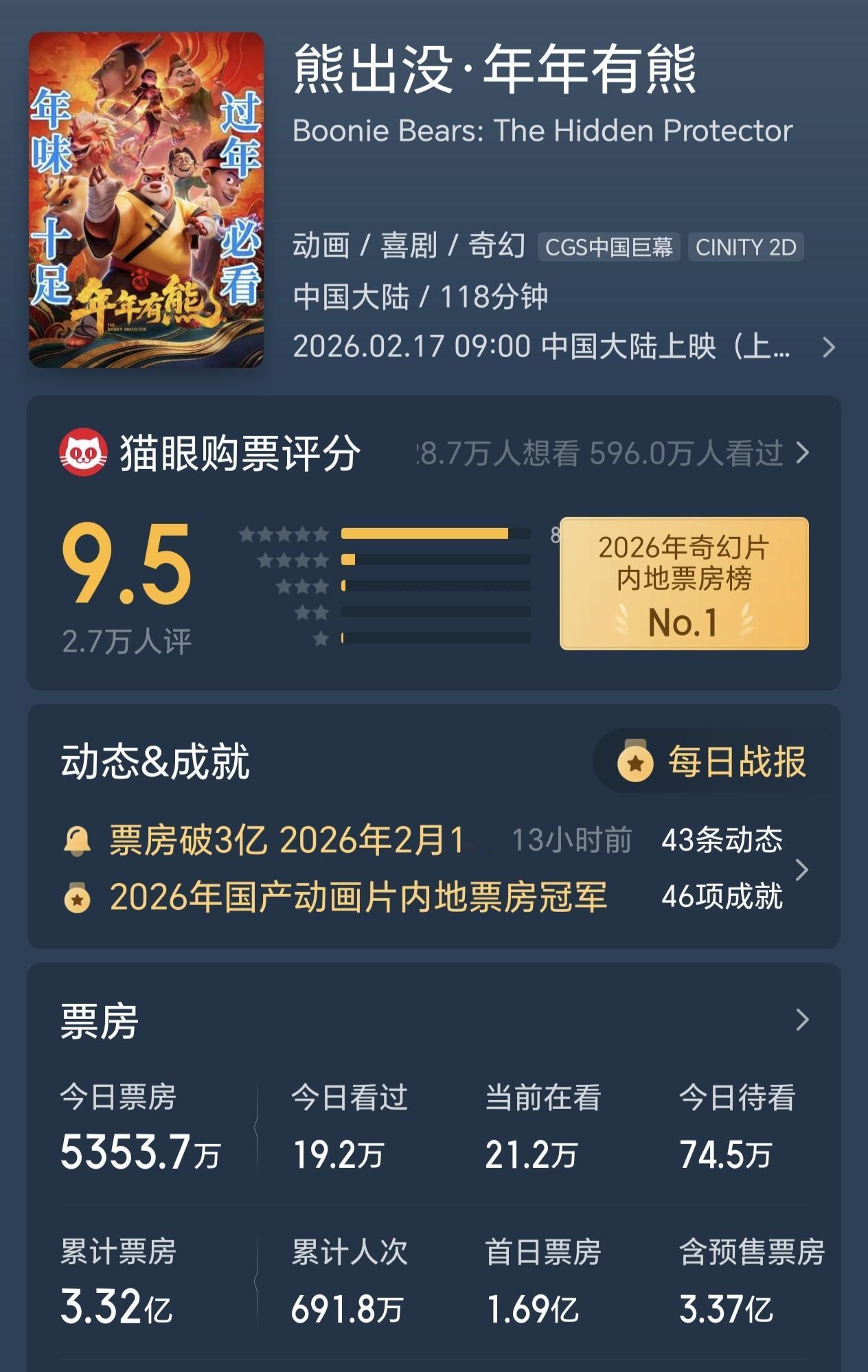春节档票房反差:吴京谢霆锋于适镖人不敌两头熊,粉丝包场难敌全民喜爱 春节档票房大战进入白热化,动画IP《熊出没》再度上演“以小博大”,让一众星光熠熠的真人电影意外落败。回看2025年春节档,肖战主演的《射雕英雄传之侠之大者》与《熊出没之重启未来》同天上映,最终熊出没以8.21亿票房稳压射雕的6.89亿,成为档期黑马。今年春节档,由吴京、谢霆锋、于适领衔的武侠大片《镖人:风起大漠》正面迎战《熊出没·年年有熊》,开局依旧被“熊强组合”压制,票房差距引发全网热议。 截至上映第3天,《熊出没·年年有熊》票房突破3.67亿,稳居档期前三;而集结四代武侠影人、耗资不菲的《镖人》仅收3.15亿,落后超5000万。有网友乐观表示“上映才三天,长线走势尚未可知”,但两组包场数据,直接戳破票房真相。《熊出没》票房贡献榜榜首为王赫野,仅包场10场,几乎全靠普通观众自发购票支撑;反观《镖人》,于适粉丝以4804场包场断层领跑,成为票房主力。这意味着《镖人》票房高度依赖粉丝应援,而《熊出没》凭借全民好感度,实现无差别观影渗透,受众底盘差距一目了然。 从影片定位来看,两部作品的票房分化早有预兆。《熊出没·年年有熊》延续系列合家欢属性,故事轻松治愈、没有天花乱坠的营销,靠的是全年龄段的真实喜爱。 而《镖人:风起大漠》作为档期唯一武侠动作片,本该颇受欢迎,却暴露多重短板。影片剧情节奏失衡,人物塑造单薄,吴京、谢霆锋等实力派戏份被稀释,于适角色缺乏成长弧光,让观众难以共情。 从去年的《射雕》到今年的《镖人》,顶级阵容与流量演员接连在《熊出没》面前折戟。话说你觉得是武侠题材和春节不适配呢?还是其他什么原因呢?