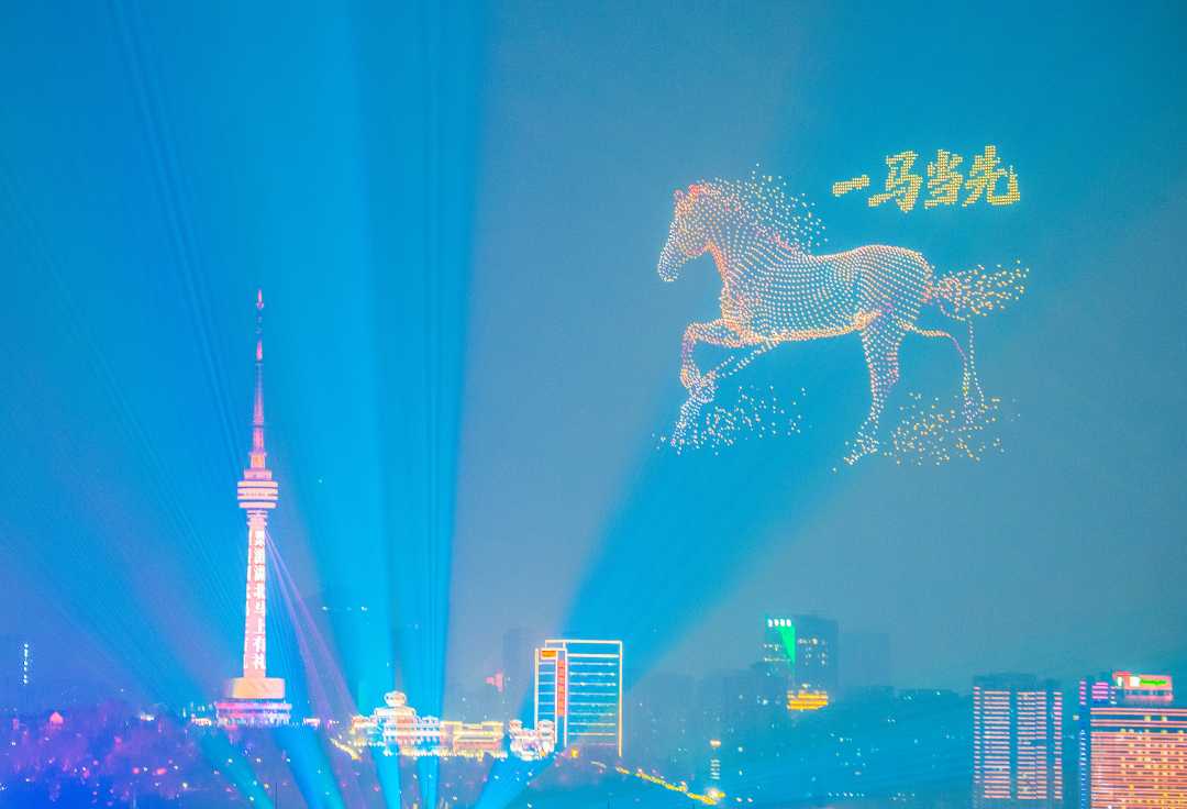 2月18日,湖北省武汉市长江两岸流光溢彩,无人机在夜空中组成“一马当先”等吉祥图案,为市民游客献上一场视觉盛宴。