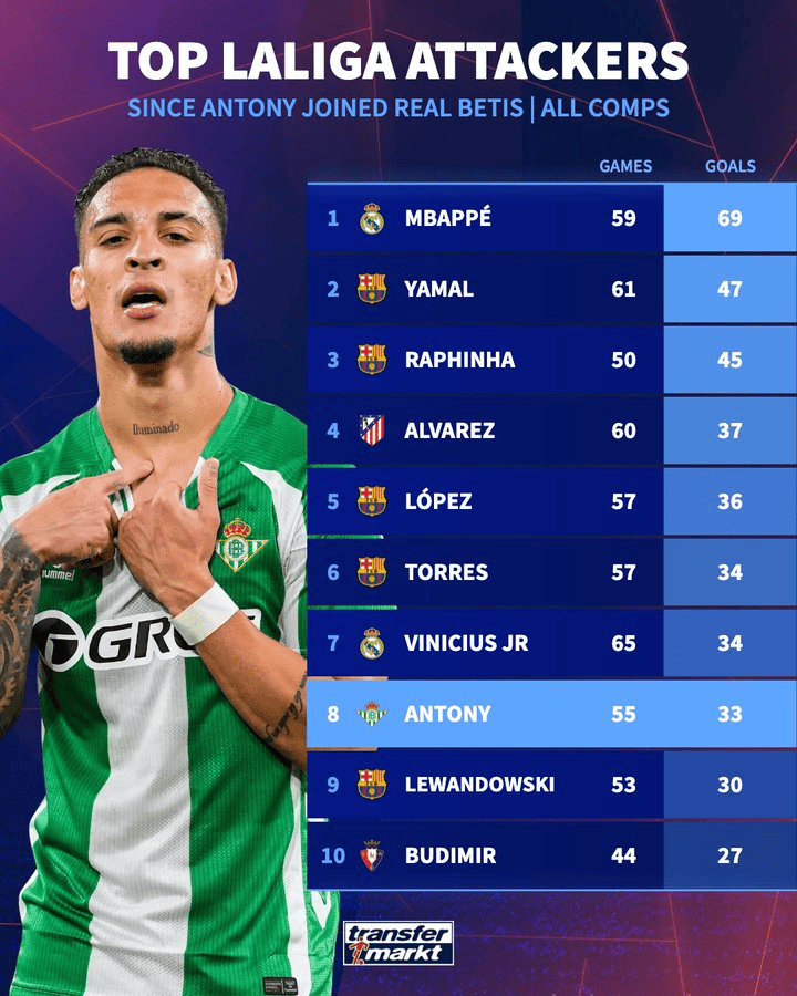 重振雄风!安东尼效力贝蒂斯55场已直接参与了33球
