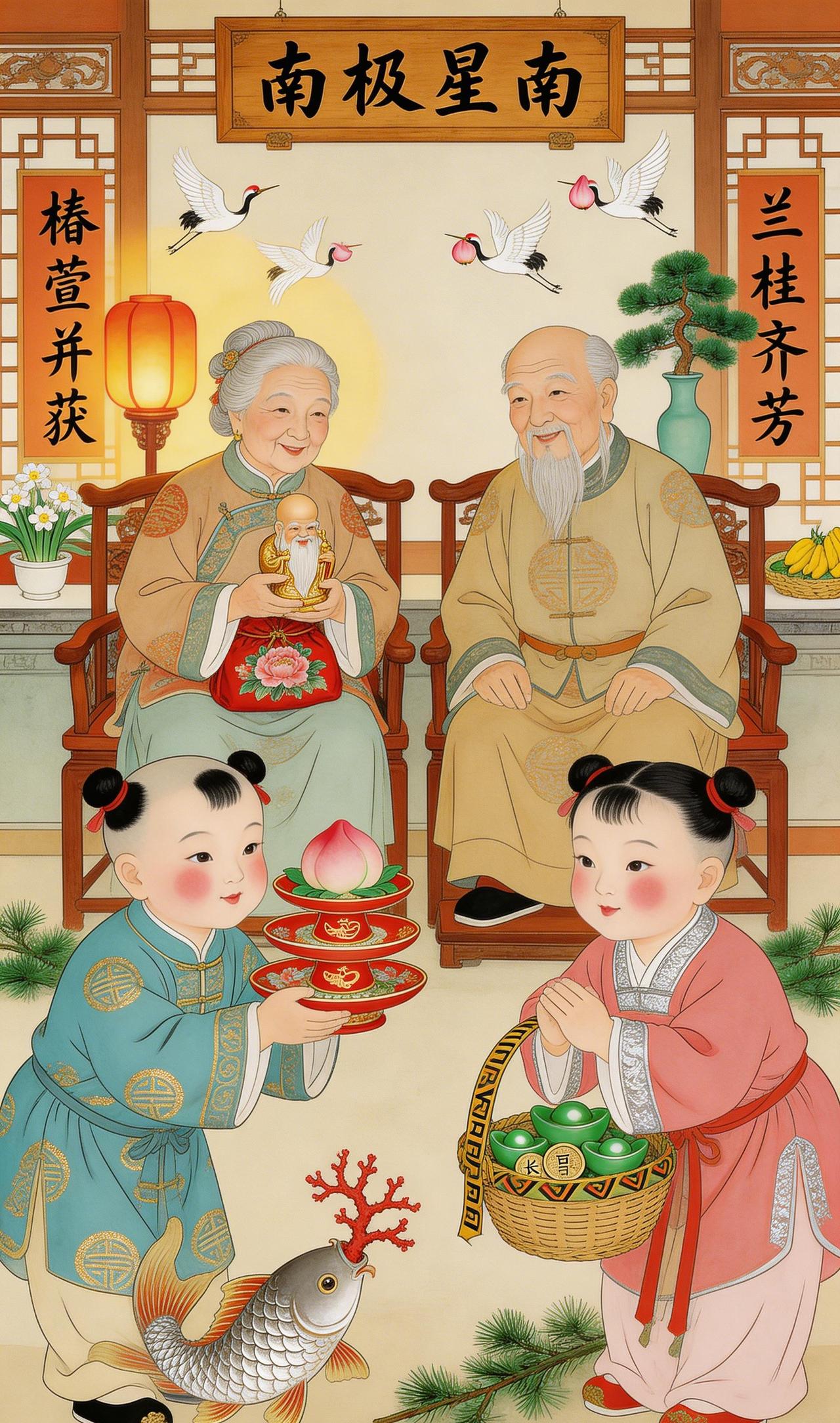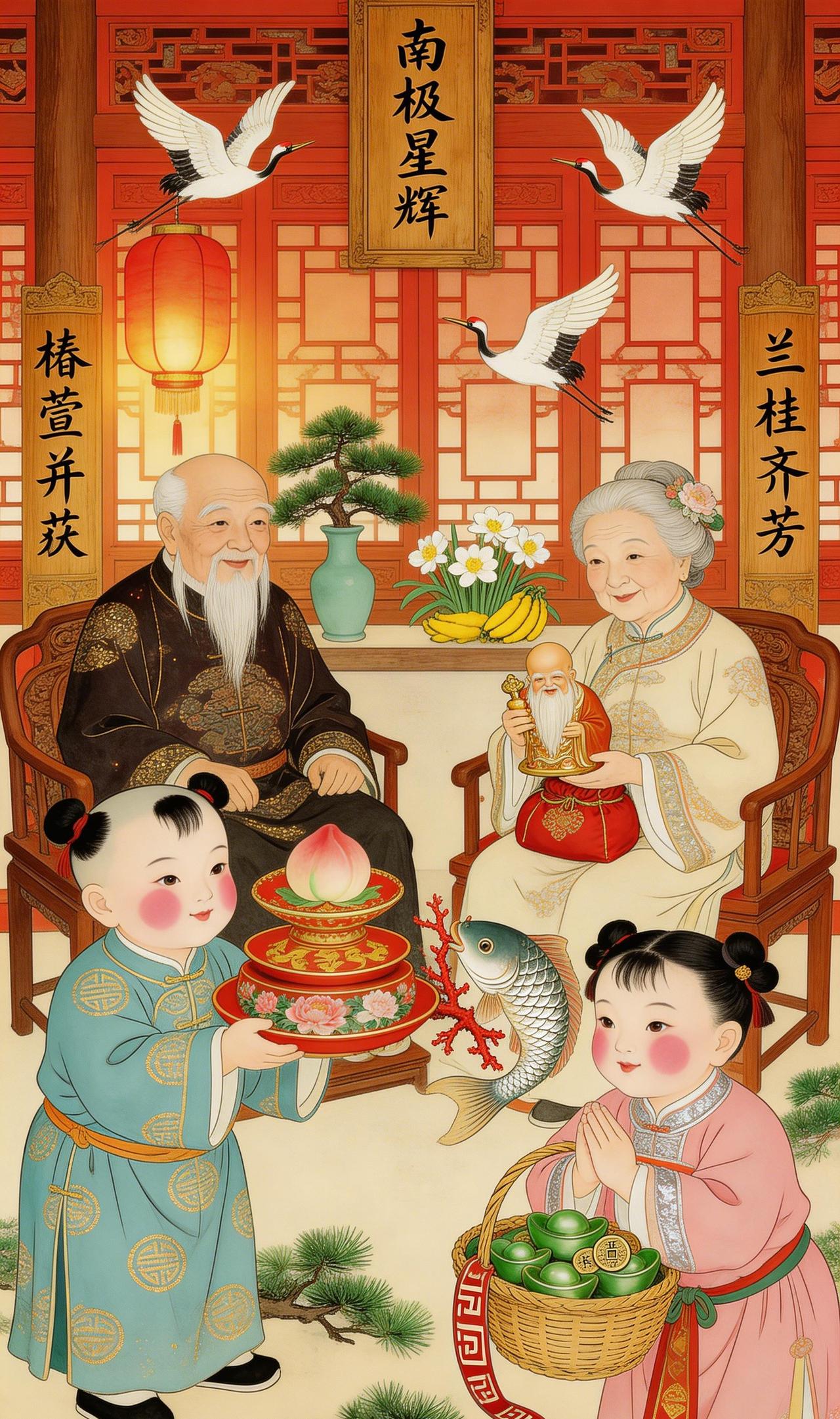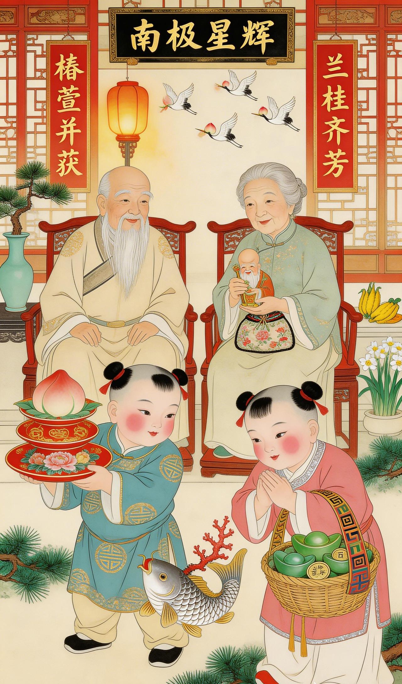 福满门庭,年味正浓 天青袍子裹着圆滚滚的小身子,金线团寿纹在烛光下一闪一闪——这是外孙特意挑选的“寿”字纹,给外公祝寿最应景。他双手捧着的朱漆描金盘上,三层寿桃颤巍巍地叠着,每个桃尖都染着胭脂红。 旁边桃红襦裙的小丫头,臂弯里那只竹编提篮沉甸甸的——满满一篮子翡翠元宝,闪着碧莹莹的光。她侧头看看哥哥,两人同时弯下腰,向端坐太师椅上的外公外婆深深作揖。 外婆笑得合不拢嘴,膝上的绣囊突然动了动——原来是有条银鳞锦鲤,正把嘴里衔着的那枝红珊瑚,轻轻往囊里放。那鱼尾巴一甩,溅起的水花都带着甜味。 这就是老辈人说的“福”吧——孩子是福,寿桃是福,元宝是福,连鱼都知道往福袋里添枝加叶。满屋子的笑声混着鞭炮香,把窗花都熏得暖洋洋的。 年画里定格的这一刻,便是中国人心里最踏实的年味:上有高堂康健,下有儿孙满堂,中间流淌着的,是代代相传的欢喜与盼望。 岁朝图