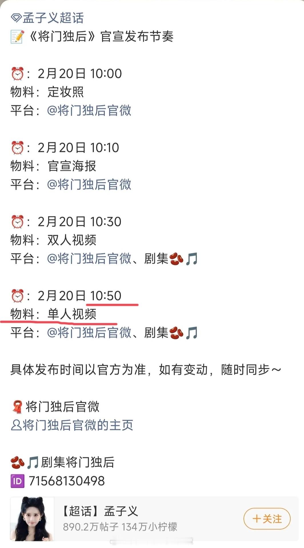 王鹤棣孟子义《将门毒后》来了,双方对接号都发将门独后官宣节奏了。男主单人视频早了