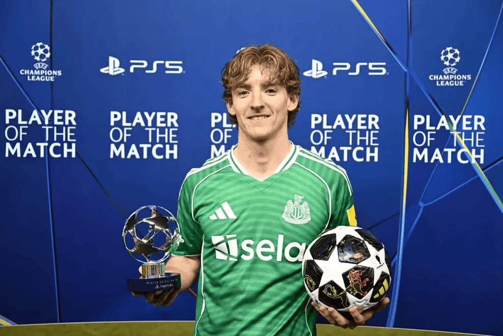 上演大四喜,官方:纽卡前锋戈登当选本周欧冠最佳球员