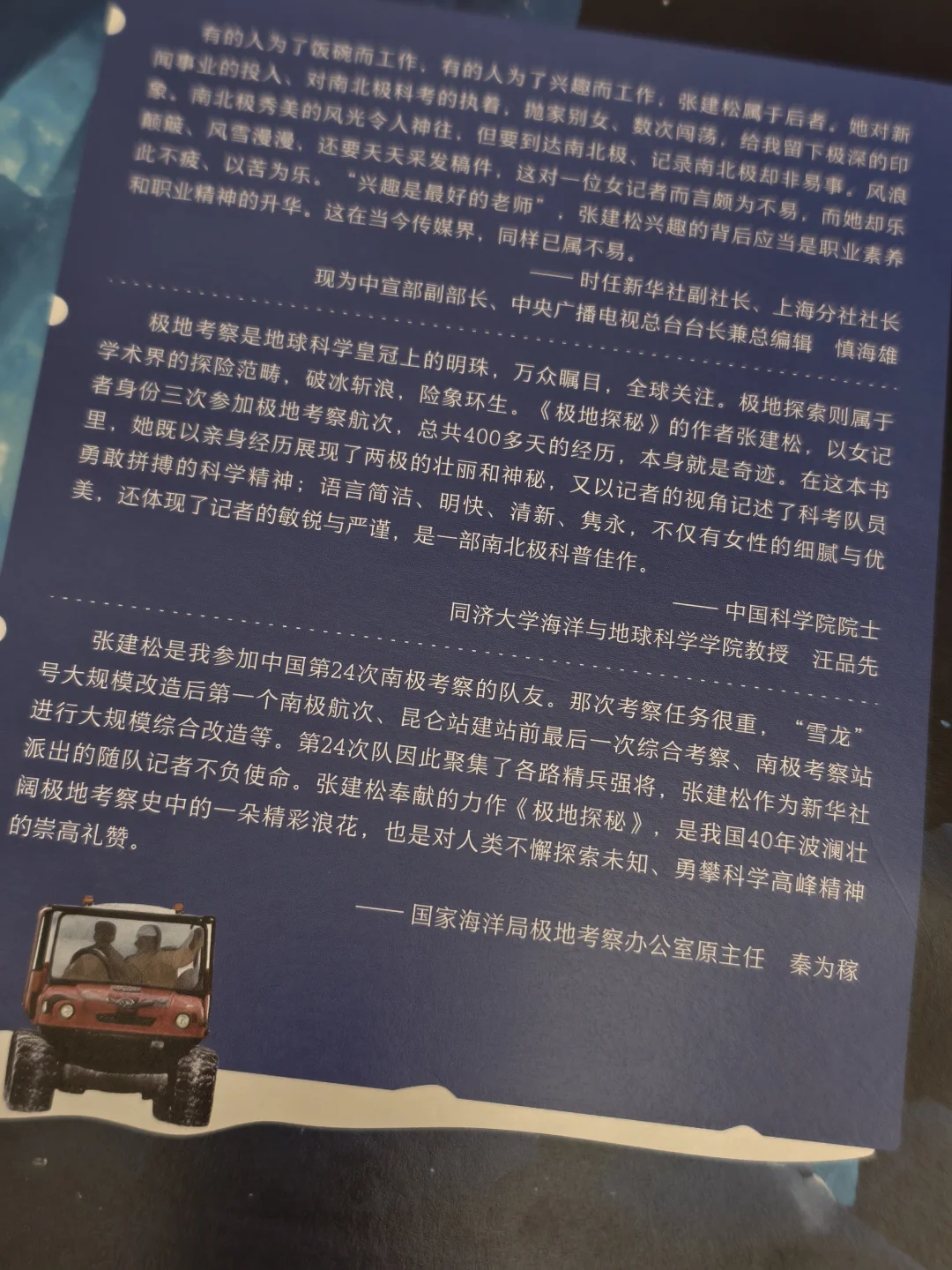 作为一位不平凡的女性,张建松以中国科学考察队随队记者的身份,两赴南极、一赴北极,用传神之笔和100余张现场照片,记录下400多天遇到的各种挑战,让读者在“雪龙”号一次次破冰前行中,见证科学家和队员们的勇敢无畏。