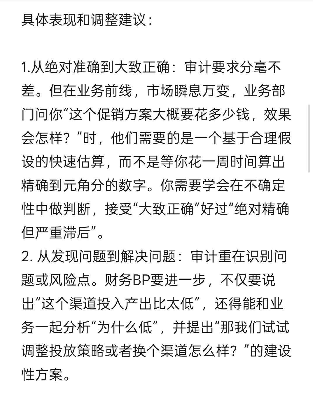2. 从发现问题到解决问题:审计重在识别问题或风险点。财务BP要进一步,不仅要说出“这个渠道投入产出比太低”,还得能和业务一起分析“为什么低”,并提出“那我们试试调整投放策略或者换个渠道怎么样?”的建设性方案。