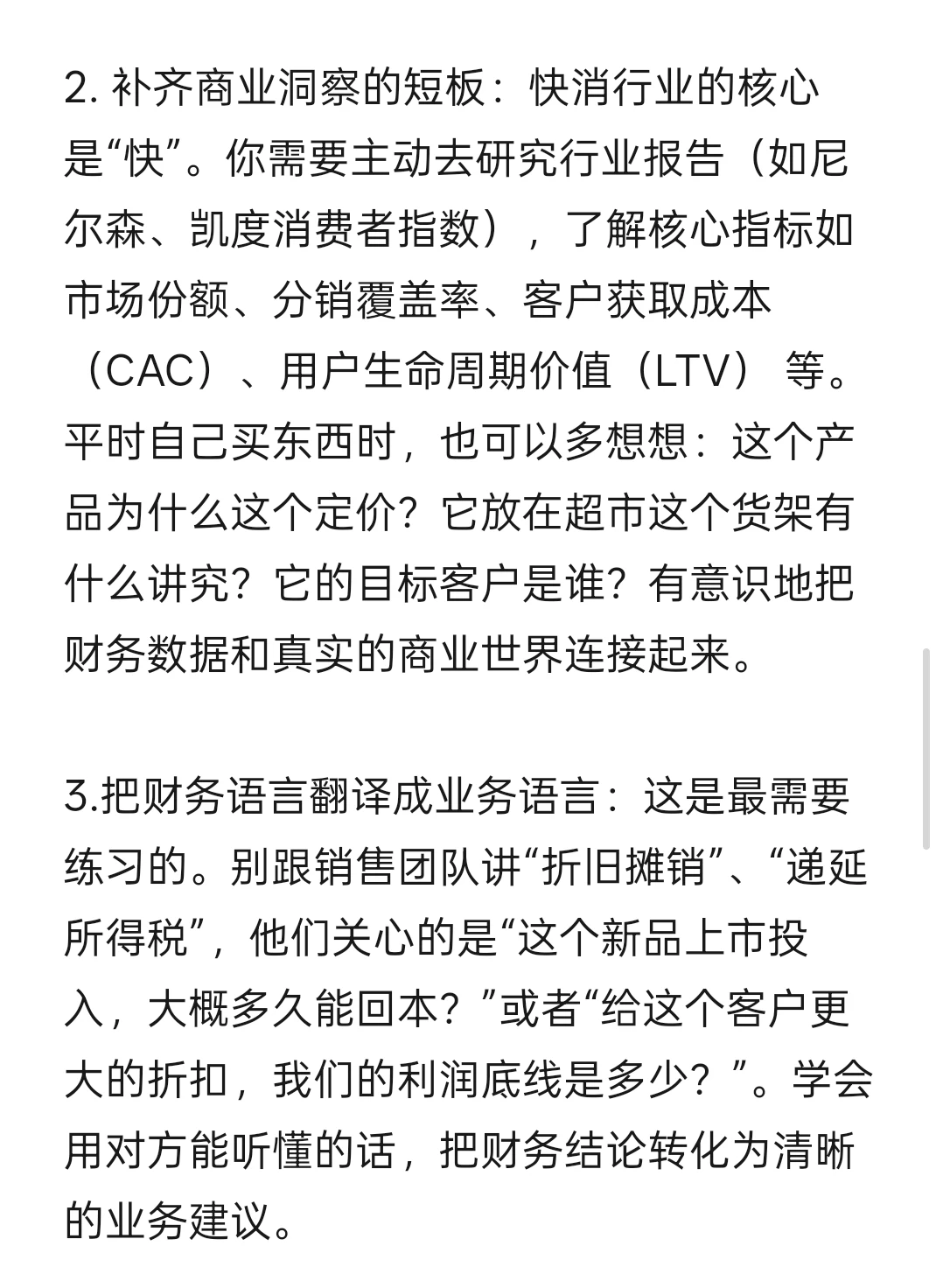 2. 补齐商业洞察的短板:快消行业的核心是“快”。你需要主动去研究行业报告(如尼尔森、凯度消费者指数),了解核心指标如市场份额、分销覆盖率、客户获取成本(CAC)、用户生命周期价值(LTV) 等。平时自己买东西时,也可以多想想:这个产品为什么这个定价?它放在超市这个货架有什么讲究?它的目标客户是谁?有意识地把财务数据和真实的商业世界连接起来。