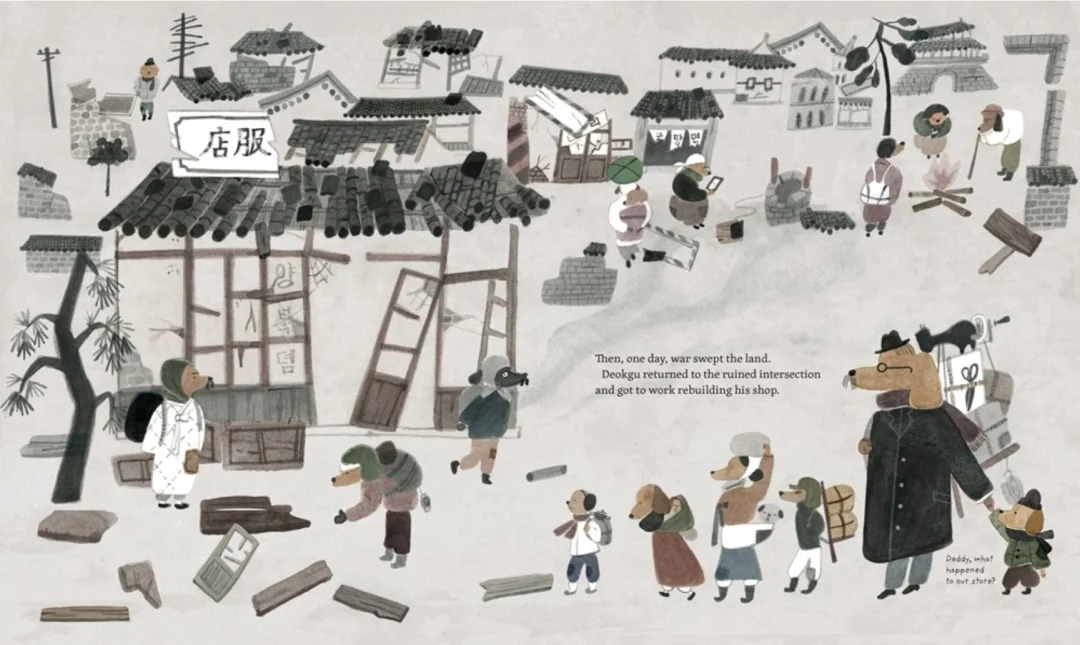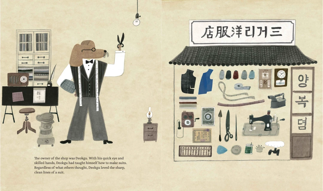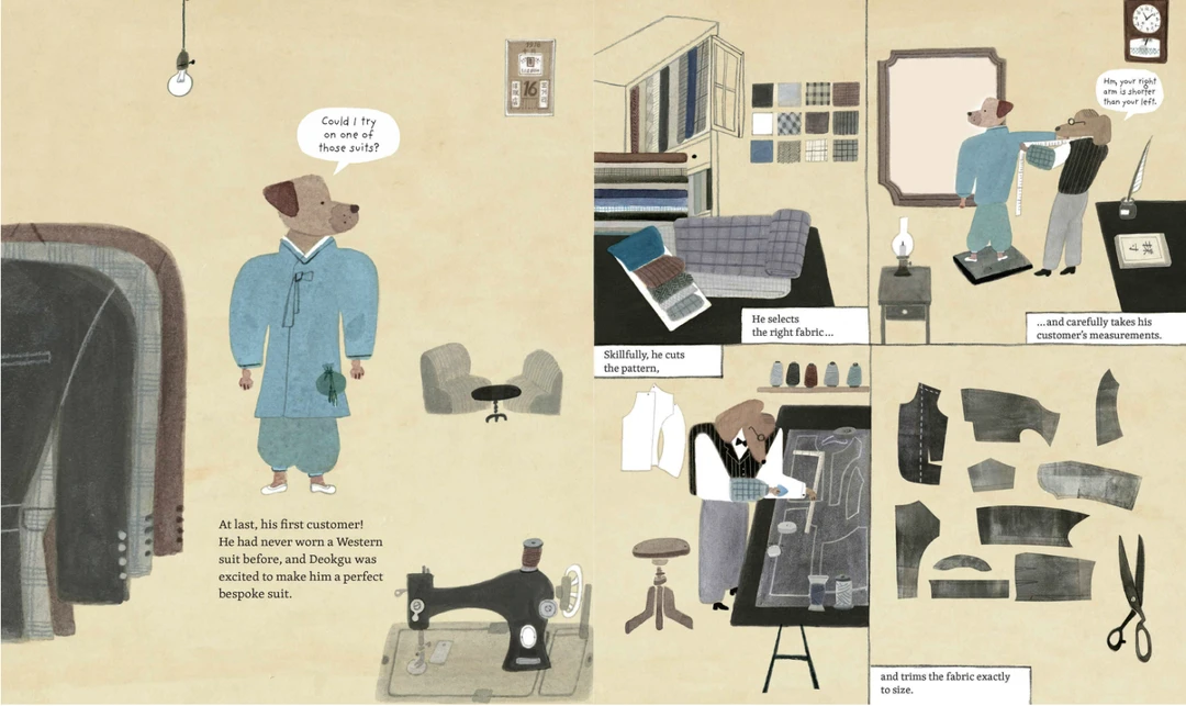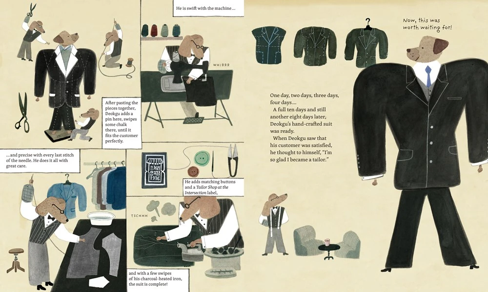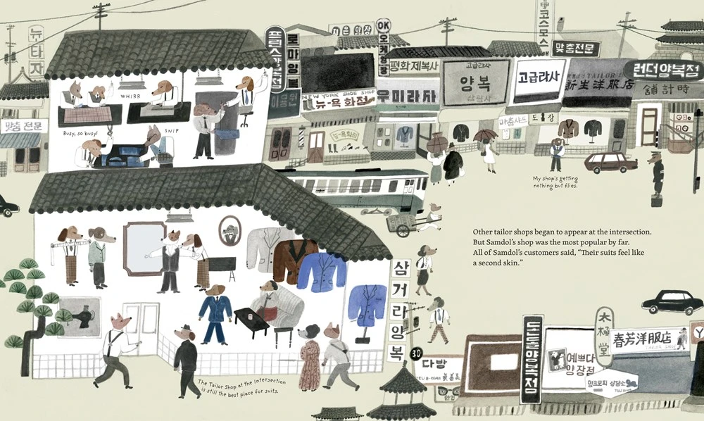 随着时间的推移,德九的坚持得到了回报,裁缝店开始生意兴隆,逐渐成为社区中备受喜爱的存在。作者 Ahn Jaesun 通过这个故事,串联起了三代裁缝的经历,将他们以及裁缝店融入到了快速发展的首尔的社会结构中 。Ahn Jaesun 获奖无数的插画,饱含深情地展现了一个更为复杂的故事:飞速的城市发展给文化、商业以及当地传统企业带来的诸多压力 。