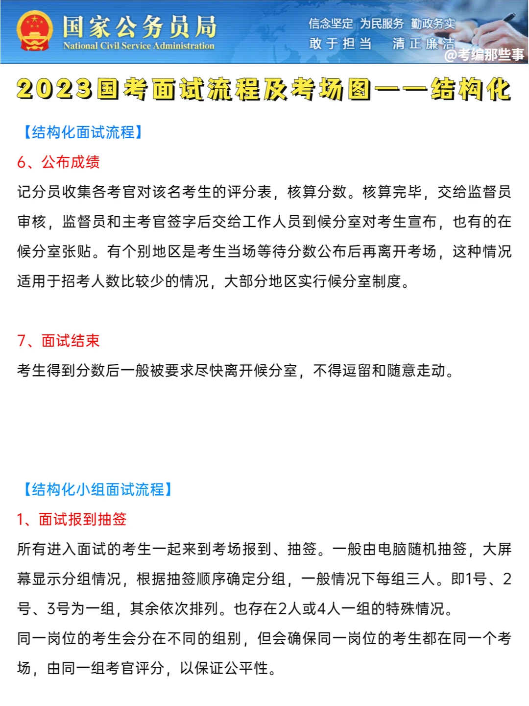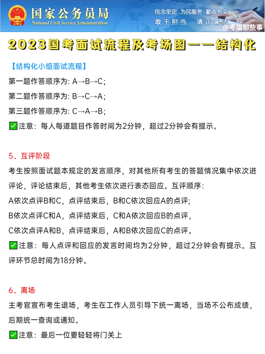 5、离场:主考官宣布考生退场,考生到候分室等候分数。