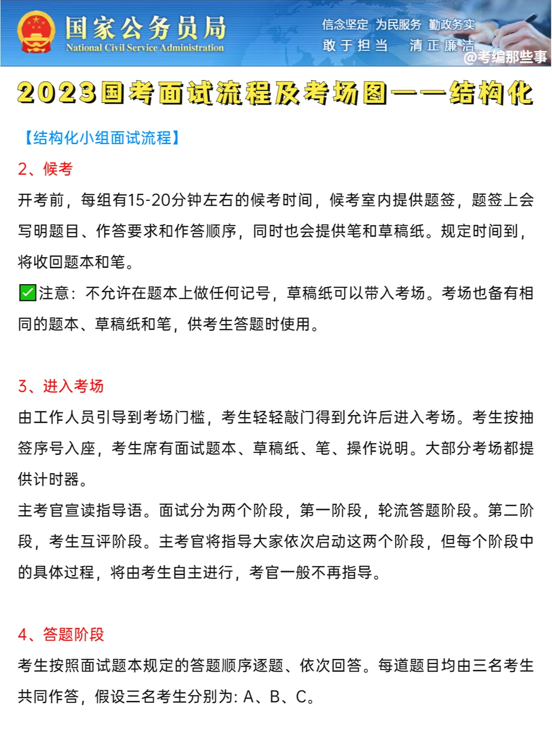 考生按抽签序号入座,考生席有面试题本、草稿纸、笔、操作说明、计时器。面试分为两个阶段,轮流答题阶段和考生互评阶段。