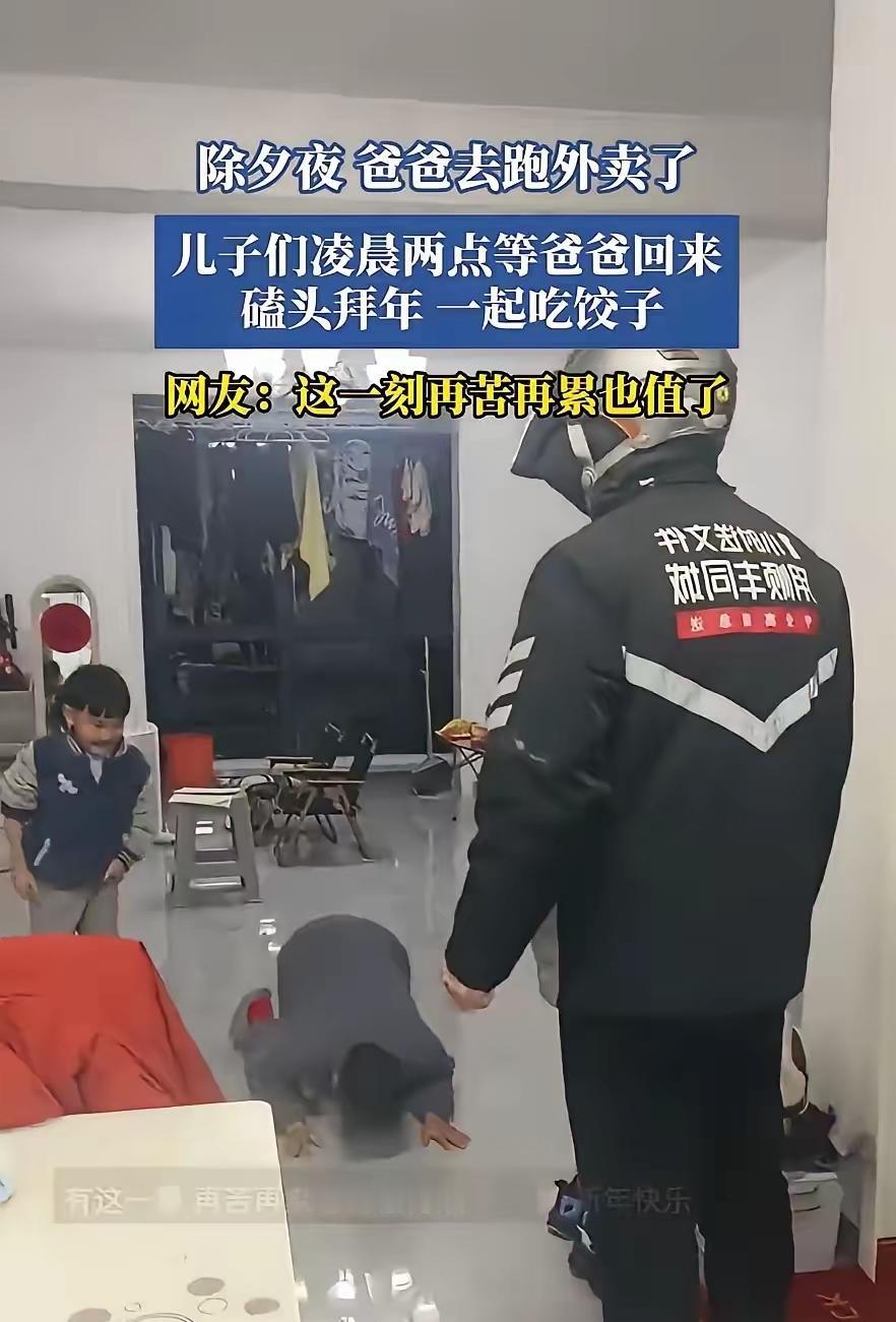 太感动了!安徽一男子除夕夜并没有在家过年,而是为了多赚点钱出去跑外卖,凌晨2点回家时,本以为老婆和孩子都已经睡了,结果一开门,两个儿子突然跑过来磕头拜年。那一瞬间,一切辛苦都值得了 门开的那一刻,他愣住了。屋里灯还亮着,电视里春晚重播的歌舞声调得很低。他带着一身凌晨的寒气,头盔还没来得及摘,手里的外卖箱空荡荡地拎着。然后,两个小小的身影,像炮弹一样从客厅沙发后面冲出来,不是扑过来抱腿,而是径直跑到他面前,“噗通”一声,并排跪了下来。“爸爸新年好!爸爸辛苦了!”小脑袋结结实实地磕在地板上。 那一刻,这个在外面冻了半宿、穿梭了大半个城市都没喊过累的男人,鼻子猛地一酸,眼眶瞬间就热了。他慌忙弯腰去拉孩子,手有点抖,嗓子里哽着东西,一句话都说不出来。 他叫李伟,一个再普通不过的名字。在安徽这座三线城市里,他干外卖已经三年了。为什么偏偏选除夕夜出去跑?平台有补贴,单价翻倍,路上车少好送,这是账面上算得清的。更深层的原因是,过年花销大,孩子的压岁钱、开春的学费、家里零零碎碎要添置的东西,都像一块块小石头,压在心里。 他是家里的顶梁柱,多挣一点,家里的底子就厚实一点。他跟老婆商量,年三十晚上他去跑单,老婆带孩子在家看春晚、吃年夜饭,等他回来再一起守岁。老婆心疼他,嘴上说着“大过年的,缺那几个钱吗”,手上却默默把他充电宝充满了电,保温杯里灌满了热水。 那一晚的街道,和他预想的一样空旷。霓虹灯比往常寂寞,偶尔有烟花在远处天空炸开。订单不多,但每一单的距离都挺远。送到一个高档小区时,开门的是个和他年纪相仿的男人,屋里热气腾腾,一大家子人的笑声传出来。对方接过外卖,顺口说了句:“师傅,这么晚还送啊,辛苦了,过年好!”就这一句,让他心里暖了一下。 他知道,他送的不仅是餐,也是别人家团圆桌上的一份便利。他送完最后一单,看了眼手机,收入比平时一晚多了近一倍。冷是冷的,累也是累的,但心里是踏实的。他想着,赶紧回家,老婆孩子应该都睡熟了,他轻手轻脚洗漱一下,也算赶上了年的尾巴。 他万万没想到,孩子根本没睡。两个孩子,一个十岁,一个七岁,下午就缠着妈妈问爸爸什么时候回来。妈妈说,爸爸赚钱去了,很辛苦。两个孩子就嘀咕着,要给爸爸一个惊喜。 磕头拜年,是他们从电视里学来的,觉得这是最隆重、最能表达敬意的礼节。他们拒绝了妈妈先睡的劝说,硬撑着眼皮等,等着爸爸开门的那一刻。那两声清脆的“磕头”声,和那两句稚嫩的祝福,是他们在自己小小的认知里,能给予父亲的最高的“奖赏”。 这份“奖赏”,为何如此触动人心?因为它直白地建立了一种最朴素的等价交换,不是金钱的,是情感的。父亲用身体的辛苦和时间的牺牲,兑换成家庭的物质保障;儿子用最传统的仪式和固执的等待,兑换成对父亲付出的全然看见和至高尊重。 这种“看见”,恰恰是许多默默付出的成年人,内心深处最渴望的东西。李伟的泪水,不是因为辛苦,而是因为自己的辛苦被最在乎的人如此郑重地“确认”了。这种确认,比任何平台的奖励、任何客户的感谢,都更有分量。它让所有漂泊在外的辛劳,一下子锚定在了家的港湾里,有了清晰的意义。 然而,感动之余,这个场景也让我们看到了一份沉甸甸的现实。它从侧面勾勒出许多普通劳动者家庭的生存状态:一份收入常显局促,需要用牺牲节日团圆、延长工作时间来换取生活空间的些许拓宽。李伟的选择,是无数个“父亲”的缩影。他们的爱,不说出口,藏在多跑的几单里,藏在深夜归家的疲惫脚步里。 这份坚韧与担当,本身已是伟大。孩子用磕头表达的,正是对这种无声伟大的懵懂感知。这种家庭内部的情感流动与支撑,是抵御生活风霜最温暖的底色。 这件事被传到网上后,很多人说“破防了”。我们为之动容的,或许不仅仅是父子亲情,更是那种在平凡甚至略显艰辛的生活里,努力经营出的尊严与温暖。父亲没有因为职业而失去孩子的崇拜,孩子用他们的方式懂得感恩。这种健康的、充满敬意的家庭关系,本身就是一种宝贵的财富。它告诉我们,生活的意义,不只在于获取了多少,更在于你为谁付出,以及你的付出是否被珍惜。 当然,我们更希望看到的是,随着社会保障的完善和收入分配的优化,每一位劳动者都能在除夕夜安心放下工作,享受团圆,而不必在“亲情”与“生计”间做如此艰难的选择。让人们的付出获得更公平的回报,让每一个家庭的温暖,不必总是以这样的牺牲和等待为前提。这才是社会进步应有的方向。 在那之前,李伟和孩子们的故事,依然会给我们力量。它提醒我们,无论外面世界如何,家永远是最后的堡垒,也是最强的动力。那些最真挚的认可,往往就来自你推开家门时,那两张等你到深夜的、纯真的笑脸。 各位读者你们怎么看?欢迎在评论区讨论。