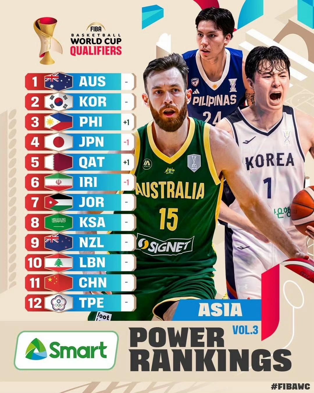 最新亚洲篮球实力榜,中国排名第11,仅比省队高1名,日本排名第四。 中国男篮危险