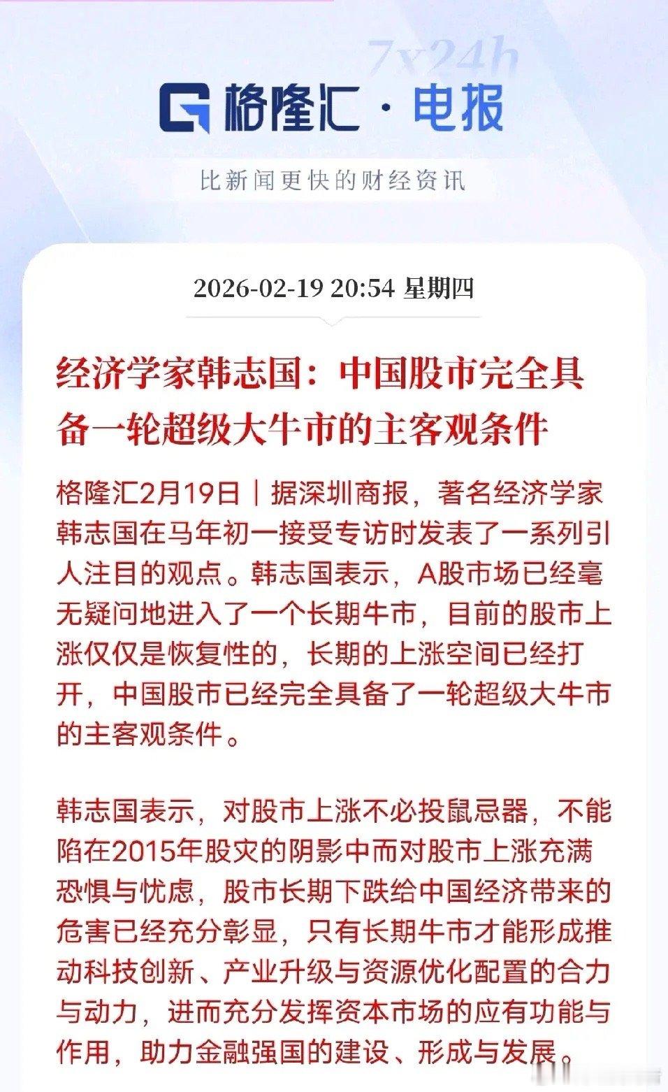 韩志国重磅发声:A股已站在长期牛市起点,马年行情不是反弹,是反转经济学家韩志国给出明确判断:A股已进入长期牛市,当前只是恢复性上涨,超级大牛市的主客观条件全面具备。这不是情绪喊话,而是政策、资金、估值、战略四重逻辑共振的结果。很多人还困在过去的调整阴影里,担心上涨不可持续。但现实已经变了:长期低迷对经济、科创、居民财富的拖累显而易见,活跃资本市场、提振投资者信心已经是明确方向,股市承担着服务科技创新、产业升级、金融强国的核心使命。从资金面看,居民储蓄规模庞大,资产配置正从房产、存款向权益市场转移,长线资金持续入场,为市场提供稳定活水。从估值看,A股仍处在全球主要市场的价值洼地,资产证券化率提升空间巨大,修复行情具备扎实基础。更关键的是,这轮行情追求的不是少数权重股拉动的指数牛,而是有财富效应、能惠及多数公司与投资者的健康牛市。政策稳、资金足、估值低、战略强,四大支撑同时到位,A股的长期空间已经打开。2026马年,与其纠结短期波动,不如看清大趋势。恢复性上涨只是开始,真正的主线行情,正在路上。今日看盘上证指数a股