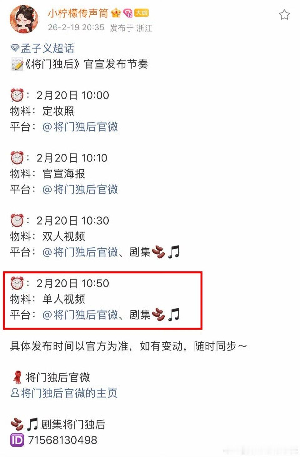 将门独后番位《将门独后》官宣物料时间差暴露真相:王鹤棣单人视频10:40发,孟子