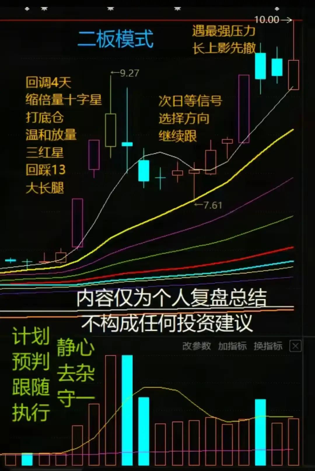 二板模式实战要点(缩编) 龙头主升浪常始于二板,散户易错失或追高。经千次复盘总结,四步可抓龙头起爆点: 1. 回调4天洗盘: - 时间:4天,不长不短,防人气散、洗盘透。 - 量能:持续缩量,末现缩倍量十字星→抛压尽,可小仓试底。 2. 温和放量吸筹: - 回调后量缓增、价上移,出“三红星”→主力暗进、抬成本。 - 回踩13日/关键均线,以大长腿K线收回→支撑有效,可加仓。 3. 次日看信号定去留: - 高开高走、放量破前高→主力强,续持/加仓。 - 遇压出长上影→抛压重,果断撤。 4. 计划+执行控风险: - 提前定建仓/加仓/离场条件;预判主力与市场情绪;跟信号不臆断;严执行不犹豫。 - 心态:静心守一,专注模式,练到极致。 本质是概率游戏,靠认知与执行力,非运气。 风险提示:经验分享,不构成投资建议,股市有风险。