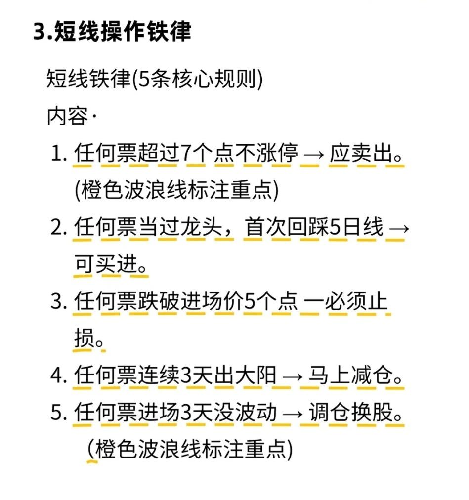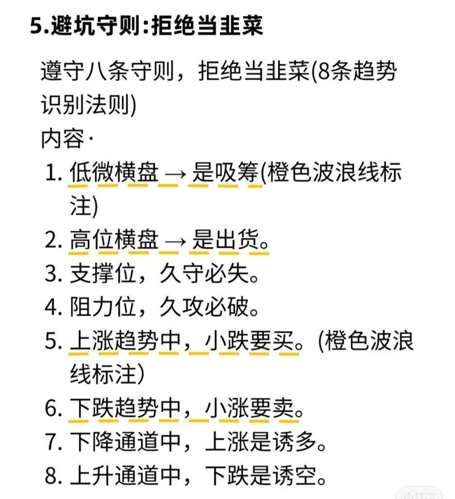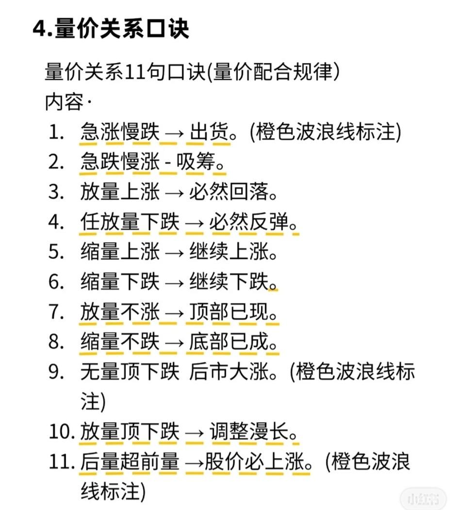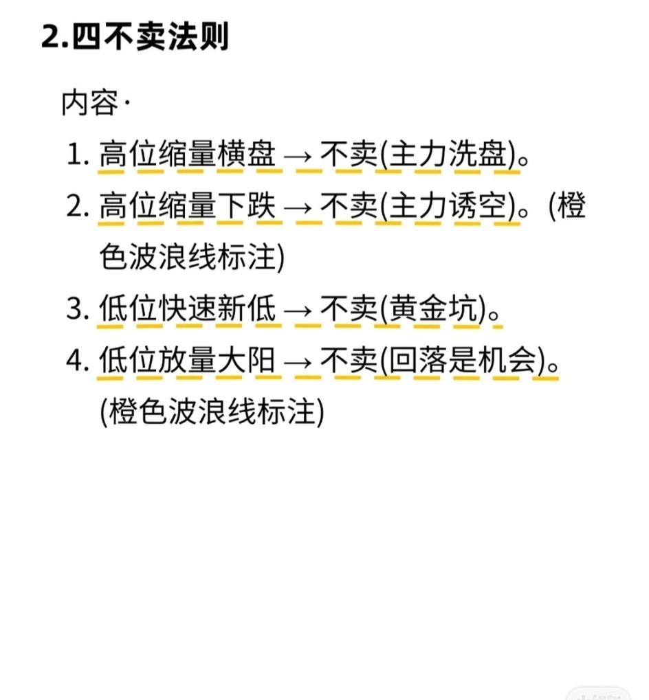 股市经验总结(5大要点): 1. 五句不败口诀:尾盘杀跌次日易高开;尾盘急拉次日易低开;早盘急拉不封板午后易回落;早盘拉升横盘易向上突破;快跌慢涨是洗盘,快涨慢跌是出货。 2. 四不卖法则:高位缩量横盘/下跌不卖(洗盘/诱空);低位快速新低/放量大阳不卖(黄金坑/机会)。 3. 短线铁律:超7点不涨停卖出;龙头首踩5日线买进;跌破成本5点止损;连3天大阳减仓;进场3天无波动换股。 4. 量价口诀:急涨慢跌出货;急跌慢涨吸筹;放量涨必回落;缩量涨续涨;无量顶跌后市大涨;后量超前量必涨等。 5. 避坑守则:低位横盘吸筹;高位横盘出货;支撑久守失、阻力久攻破;上涨小跌买、下跌小涨卖;下降通道涨诱多、上升通道跌诱空。
