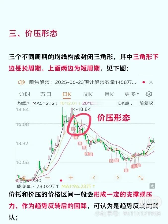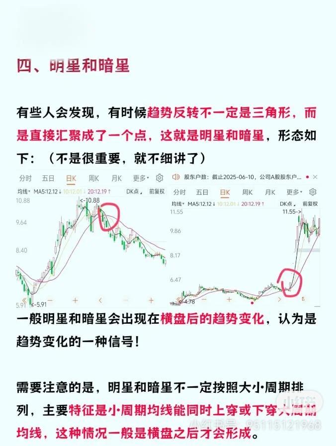 股票均线形态判断趋势的知识: 1. 多头/空头排列:短期均线在上为多头(上涨趋势,下方均线支撑);短期均线在下为空头(下跌趋势,上方均线压力)。 2. 价托形态:均线构成上边长周期、下边短周期的三角形,是多头排列的过渡信号。 3. 价压形态:均线构成下边长周期、上边短周期的三角形,是空头排列的过渡信号。 4. 明星和暗星:横盘后小周期均线同时上穿/下穿大周期均线形成的点状信号,标志趋势可能反转。