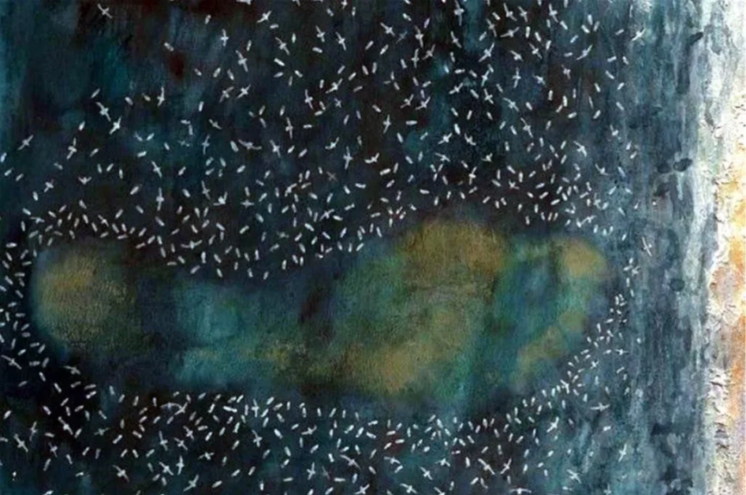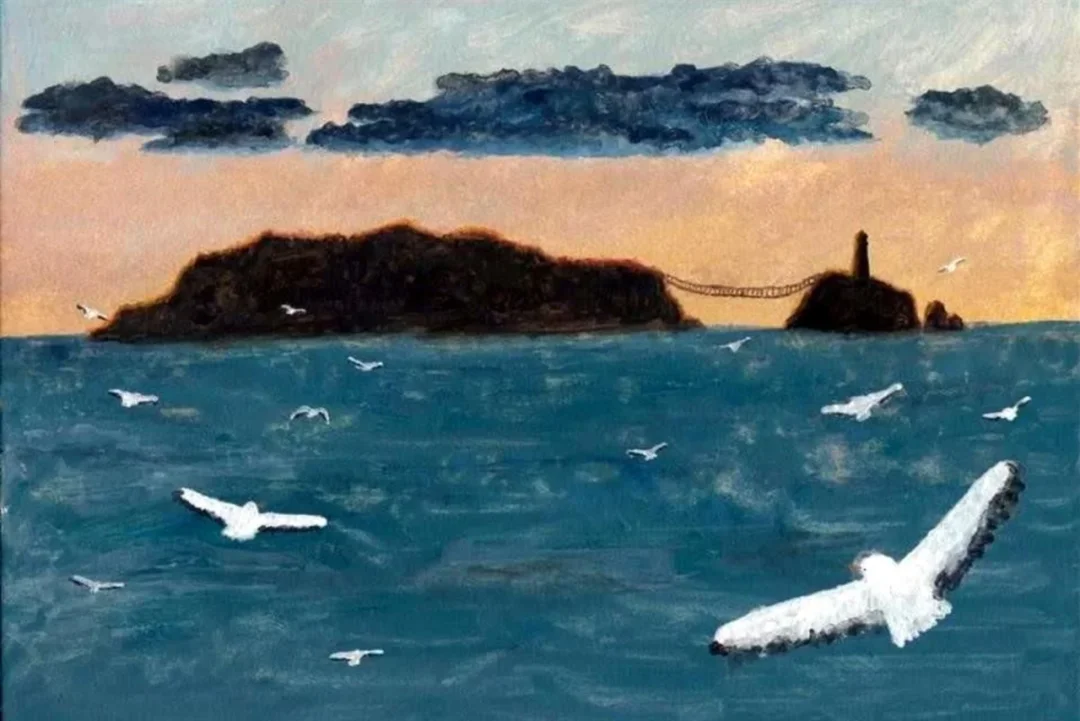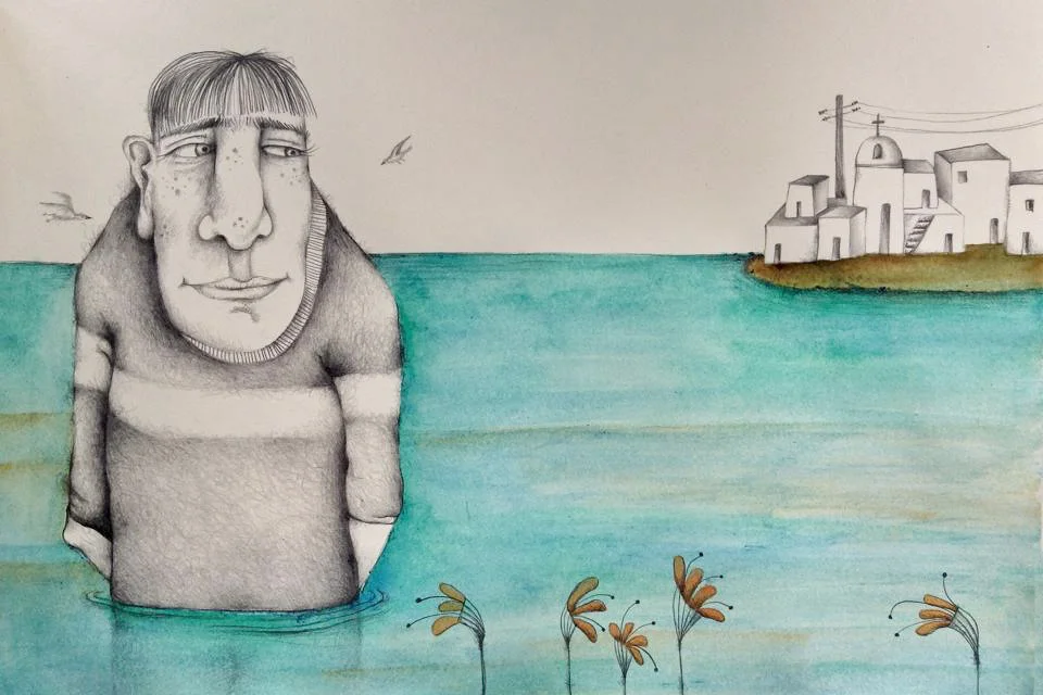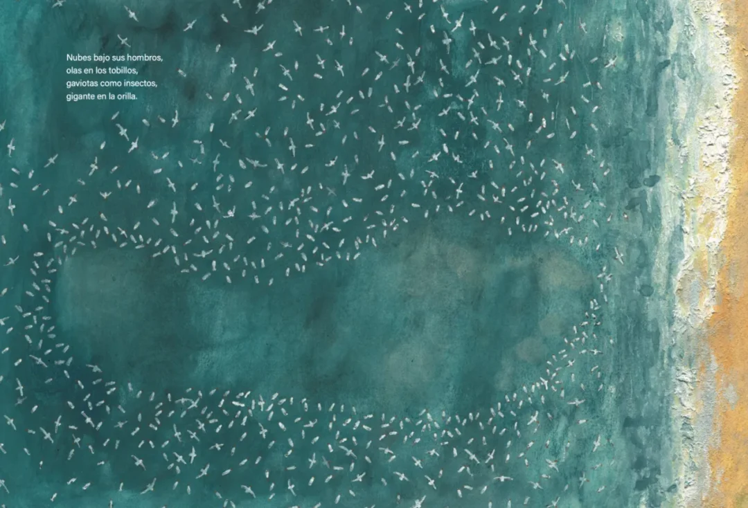 肩膀下面是云,脚踝是波浪,像昆虫一样小的海鸥,岸边是巨人。