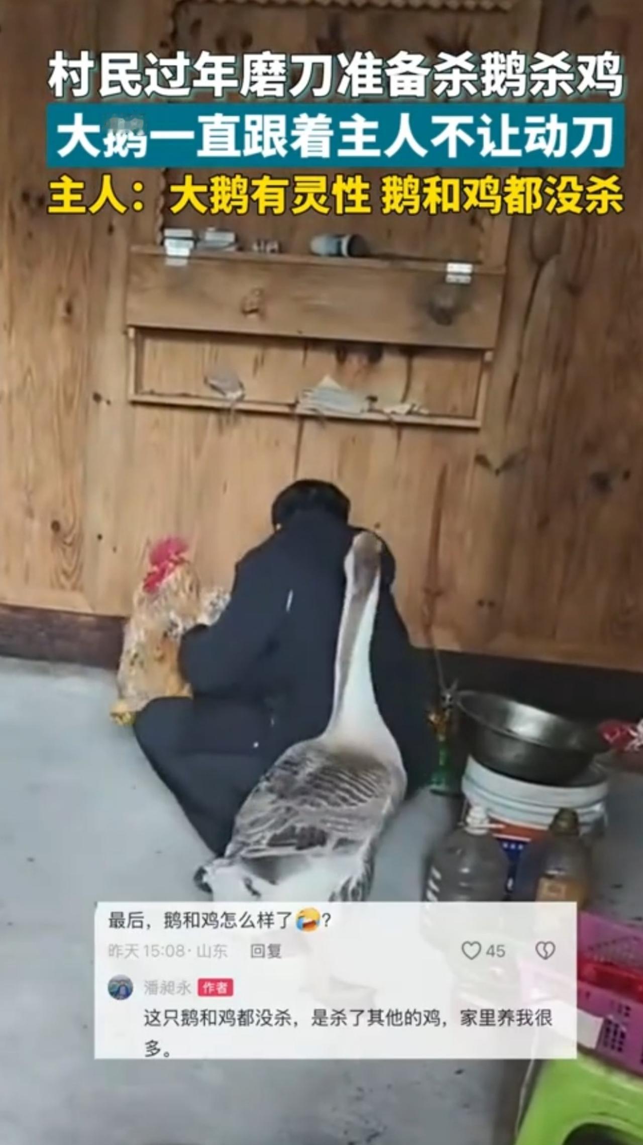 大鹅担当 近日,贵州黔东南一村民过年磨刀准备杀鹅杀鸡时,但大鹅持续跟随主人并阻拦动刀。这鹅是有点聪明,平时会看家驱逐外来的人,关键时候还会救朋友。在大鹅的跟随阻挡下,主人放弃杀鸡杀鹅。 鹅不让人杀鸡,这是鹅与其他家禽共生过程中形成的感情不?