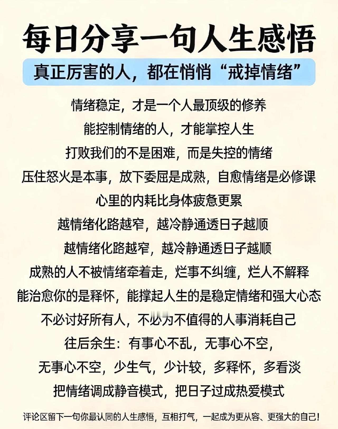 今天想和大家聊一句扎心又真实的人生感悟:情绪稳定,才是一个人最顶级的修养。 我们这一生,会遇到多少糟心的人、破事,就会明白:能控制情绪的人,才能掌控人生。很多时候,打败我们的不是困难本身,而是失控的情绪。 年轻时总以为,发脾气是本能,忍住不发是懦弱。后来才慢慢懂得,能压住怒火,是本事;能放下委屈,是成熟;能自愈情绪,才是成年人的必修课。 你有没有发现,生活里最累的,往往不是身体的疲惫,而是心里的内耗。 为一句话耿耿于怀,为一件事反复纠结,为一个人过度期待,最后伤的是自己,耗的是精力,耽误的是前程。 其实这个世界很公平: 你越情绪化,路越走越窄; 你越冷静通透,日子越顺越宽。 真正成熟的人,不是没有情绪,而是不再被情绪牵着走。 难过时,默默自愈;委屈时,悄悄消化;愤怒时,先静下来再说话。 他们明白,烂事不纠缠,烂人不解释,就是对自己最好的保护。 很多人总在等别人安慰,等别人理解,等别人来救自己。 可到最后才懂:能治愈你的,从来不是时间,而是你心里的释怀;能撑起你人生的,从来不是运气,而是你稳定的情绪和强大的心态。 日子是自己的,心情也是自己的。 不必讨好所有人,不必强求每一份理解,不必为不值得的人事消耗自己。 往后余生,愿你: 有事心不乱,无事心不空, 少生气,少计较,多释怀,多看淡。 把情绪调成静音模式,把日子过成热爱模式。 你会发现,当你情绪稳了,路就顺了,人生一切都会慢慢好起来。 💬 评论区留下一句你最认同的人生感悟,互相打气,一起成为更从容、更强大的自己!