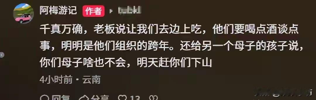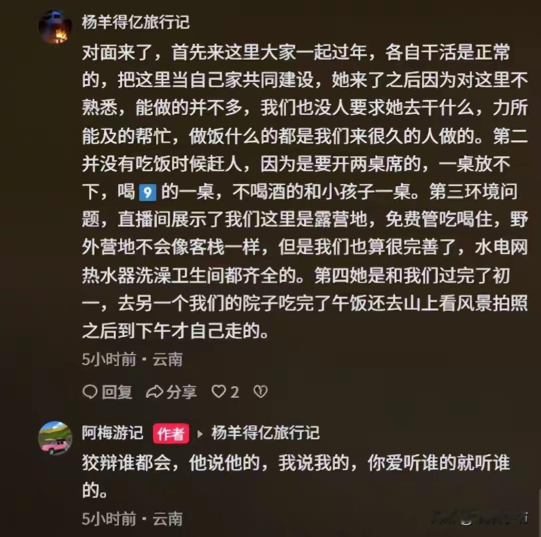 大理民宿被赶出年夜饭现场,免费入住却遭区别对待。 甘肃女孩阿梅是个旅行博主,开着粉色房车卖咖啡赚钱。今年春节前,她在网上看到云南大理一家民宿招人一起过年,对方说吃住全包不用带东西,她就去了。 到地方后开始几天还行,大家一块干活布置院子,她洗菜串肉挺勤快。除夕当天,民宿老板突然让有些人去边上吃饭,还骂走了一家母子。阿梅气得想立刻走,但天黑路不熟只能留一宿。第二天主人一直让她早点离开,她就和另外几个人当天走了。 这事被阿梅发网上引起热议。有人觉得她空手去太不懂事,也有人说主人不该大年初一赶人。后来有当时在场的人出来解释,说分桌是因为人多,并非针对她。还有知情人爆料民宿老板常赶走干活慢的人。 民宿老板后来在评论区说不想理这些烂事,反复刷屏让支持她的话。阿梅的视频播放量涨了好多,但双方各执一词没谈拢。 这个事件反映了现在找陌生人一起过的风险,大家一开始都没说清楚各自权利义务。免费提供吃住是一回事,但干活多不多、怎么分待遇都没明确。阿梅觉得付出就应该被尊重,老板可能觉得她干活不够好。 现在网上找搭子过节的人越来越多,但多数都是口头约定,发生矛盾没人管。阿梅的遭遇说明,在陌生社交里还是该把规则说清楚,别光图免费或浪漫,不然容易出问题。 事件到这就结束了,民宿老板再没回应,阿梅也没再提新进展。有网友说这事让他们更警惕找搭子的事,但也有人继续尝试,毕竟是新的社交方式。