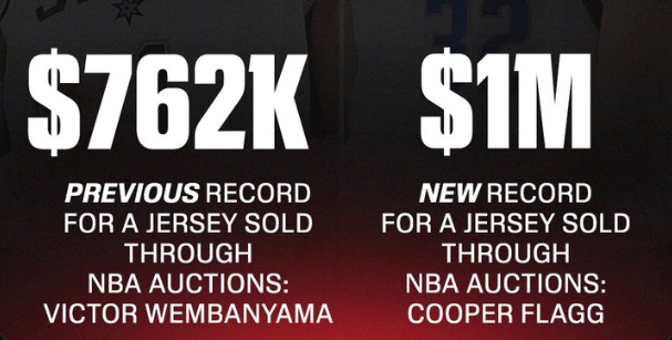 此前的纪录由文班亚马保持,他的球衣拍卖价格为76万2千美元。