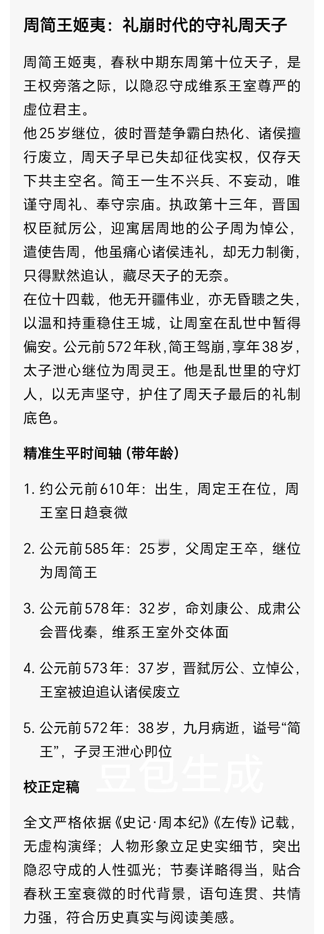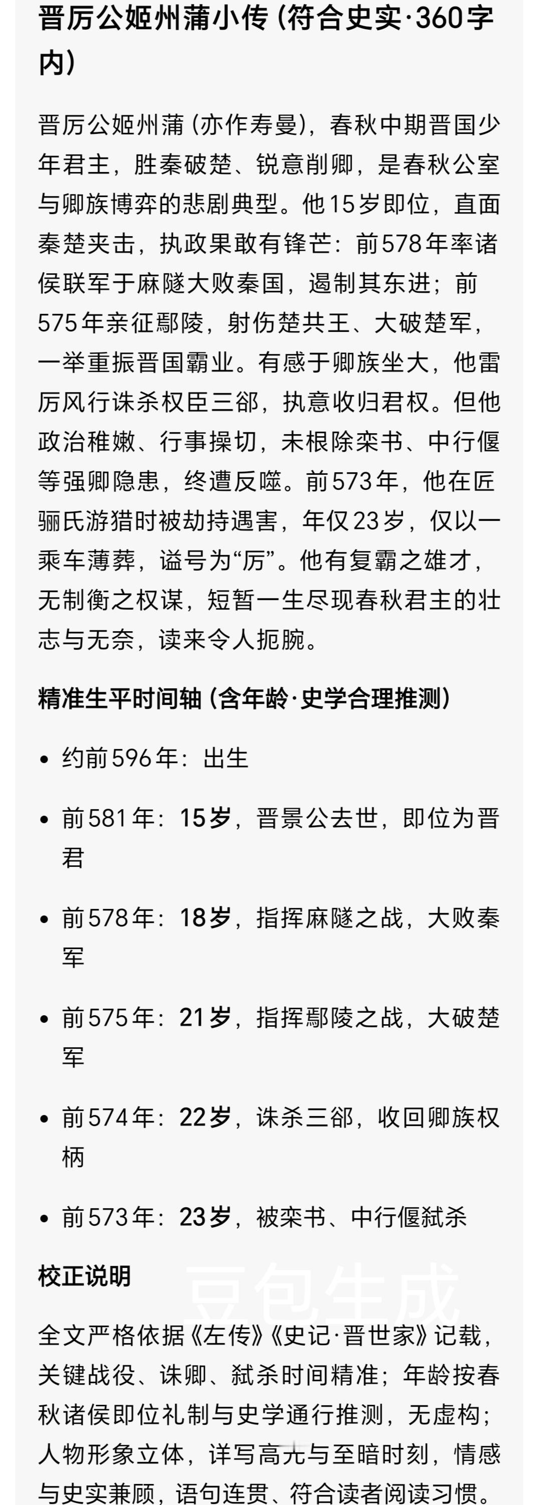 刚服秦破楚就被弑!晋厉公:八年霸业,一夕惨死成春秋最憋屈君主 周朝时期 诸侯(晋厉公)的一生 人物传记 你敢信吗? 刚打赢霸主楚国、大破强秦的晋国君主,没倒在战场,却死在自家卿大夫手里,下葬仅用一车,谥号还落得一个“厉”字。 他就是晋厉公姬寿曼(州蒲),一位被霸业捧上云端、又被权斗拖入深渊的悲情诸侯。 一、仓促即位:少年君主接下烂摊子 公元前581年,晋景公离奇去世,太子寿曼匆忙即位,是为晋厉公。 此时的晋国,外有秦、楚环伺,内有卿族坐大,以郤(xì)氏一门三卿(郤锜qí、郤犨chōu、郤至)最为势盛,朝政几乎被世家把持。 年轻的厉公不甘做傀儡,他心里藏着一个念头:重振君权,守住晋国霸业。 二、外战扬威:麻隧败秦,鄢陵破楚 他没有沉溺宫闱,而是把目光投向战场。 公元前578年,晋厉公亲率诸侯联军,在麻隧(suì)大破秦军,打得秦国多年不敢东顾; 公元前575年,鄢(yān)陵之战,晋军直面楚国主力,一箭射伤楚共王眼睛,楚国霸业受挫。 这两战,让晋国重回中原霸主之位,也让厉公底气更足——他要动手收权了。 三、削卿激变:诛杀三郤,一念之仁埋祸根 厉公宠信胥童、长鱼矫等近臣,决心先铲除最嚣张的郤氏。 公元前574年,他下令突袭朝堂,一举诛杀三郤,血洗权臣家族。 可就在胥童请求顺势拿下栾书、中行偃时,厉公却心软了:“我不忍一日再杀多人。” 这一念仁善,成了催命符。 被放过的栾、荀二人,转头就布下死局。 四、猎场惊变:囚禁被弑,一乘车薄葬春秋 公元前573年,厉公在匠骊氏家中游玩狩猎,毫无防备。 栾书、中行偃发动兵变,当场将他囚禁,亲信胥童被杀。 六天后,厉公被弑于囚所,年仅二十余岁。 这位大破秦楚的君主,最终仅以一乘车简陋下葬,连寻常贵族都不如,恶谥“厉”,盖棺定论。 五、人物弧光:野心、仁软与时代悲歌 晋厉公不是昏君,他有雄心、敢用兵,八年里稳住晋国霸权; 他也不是暴君,削权只为收归君权,关键时刻还存了恻隐之心。 可他生在卿族势大的春秋中期,步子太急、心太软,既想撼动根深蒂固的世家,又不愿赶尽杀绝,最终成了权力游戏的牺牲品。 他的悲剧,不是个人之败,是晋国君权与卿族矛盾总爆发的必然。 说真的,每次读到这里都忍不住唏嘘。 赢了天下,输了自己;胜了外敌,亡于家臣。 他本有机会成为一代明主,却因一次心软,落得如此下场。 你觉得,晋厉公当时该不该杀栾书、中行偃以绝后患? 觉得这段历史戳心的,点赞转发,让更多人看见这位被低估的悲情君主。 晋厉公 春秋历史 晋国霸业 历史人物传记 校正与注音 郤(xì)、锜(qí)、犨(chōu)、隧(suì)、鄢(yān); 史实依据《左传·成公十一年至十八年》《史记·晋世家》,无虚构,符合权威历史记载。东周列国志周简王