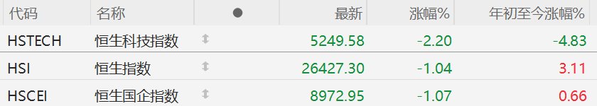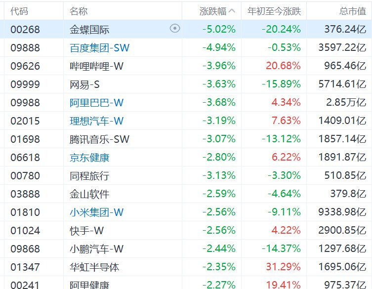 格隆汇2月20日|港股跌幅进一步扩大,恒生科技指数跌2.2%,恒指、国企指数跌超1%。恒生科技指数成分股中,金蝶国际跌5%,百度集团跌近5%,哔哩哔哩、网易、阿里巴巴、理想汽车、腾讯音乐、同程旅行跌超3%。