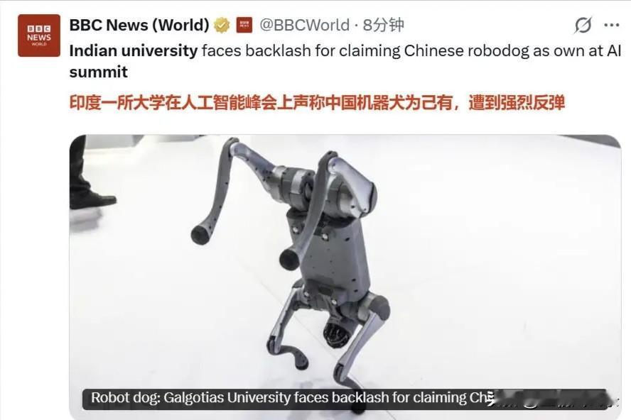 用中国机器狗充自研!印度媒体称“着实令印度尴尬” 一则消息令印度人无地自容。印度一所大学竟然将刚刚购买的中国机器人冒充自己的研发,很快就被揭穿了底细。 2月18号,《印度时报》报道,在新德里举办的印度人工智能影响力峰会期间,加尔戈蒂亚斯大学教授妮哈·辛格向媒体介绍一款名为“猎户座”的四足机器狗,称其为该校研发成果。相关视频迅速在社交媒体发酵,有网友指出,该机器狗实际由中国企业研发。 这个消息很快风靡印度,社交媒体上引发大量网友嘲讽,主办方随即对该大学下“逐客令”。 鉴于印度网友铺天盖地的声讨,校方很快就在社交媒体账号承认这款机器狗确实是中国产品,强调说只是作为教学工具,并没有说是自己开发的。 印度反对党国大党趁机拿该事件说事,也称该事件“着实令印度尴尬”。国大党方面在社交媒体上写道,这一事件是此次峰会“一场混乱的公关闹剧”“给印度的形象造成无法补救的损害”。