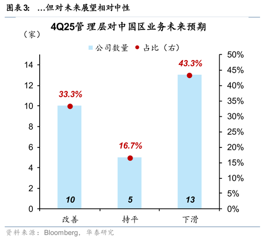 多数企业管理层认为中国区业绩在4Q25有多改善,但对未来展望中性。样本内45.2%的跨国企业中国区收入4Q25有所改善,29%持平;但有43.3%的企业管理层认为未来业绩可能下滑,33.3%的企业认为可以改善。分行业看,金融、材料、传媒和日常消费对未来展望乐观预期的比例相对更高,可选消费、信息技术略显平淡。