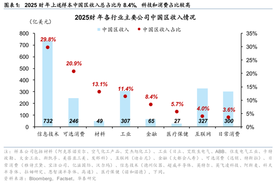 2025财年上述样本中国区收入总占比为8.4%,科技和消费占比较高。信息技术、可选消费两大行业的中国区收入占比超过20%,但日常消费、互联网和医疗保健占比较低。