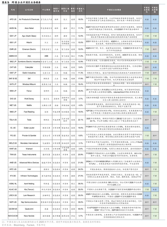 电气设备:4家电气设备企业中国收入占比10%~16%,ABB和日立最新季度中国区收入同比上升、艾默生下降(住友推测也下降)。受地产影响的传统电气业务下滑,而运动控制、自动化、能源转型相关方向需求亮眼,日立提及更新改造带来的增量需求。2026年ABB和日立展望改善、艾默生持平(但关注2H26改善机遇)、住友谨慎。