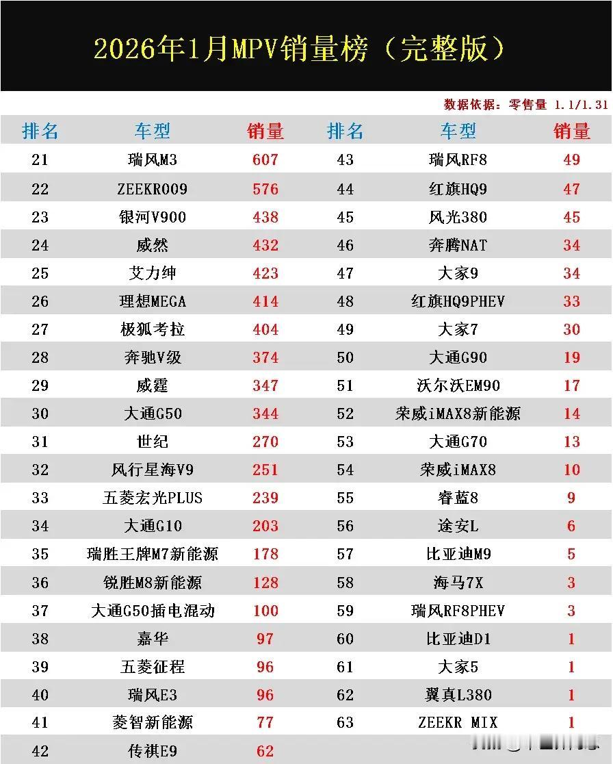 2026年1月MPV零售量排行榜已正式公布了!快来看看你的爱车排在第几名? 第一名赛那销量9133辆。 第二名魏牌高山销量6707辆。 第三名传祺M8销量5445辆。 星光730、格瑞维亚分别名列第4第5,各自销量也都在5千辆以上。