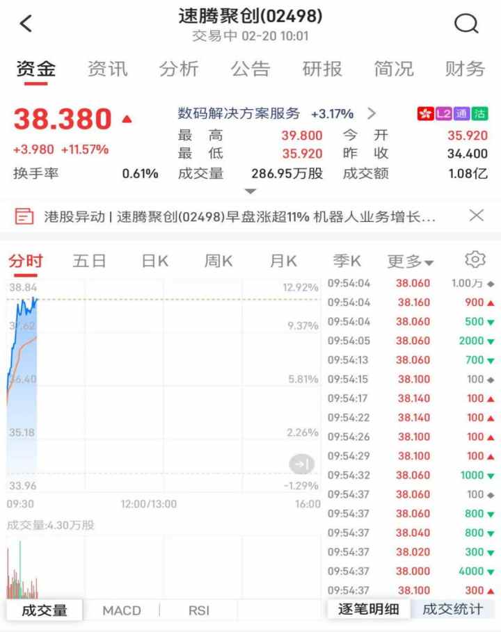 受此利好影响,速腾聚创股价于2月20日早盘高开高走,盘中一度上涨至39.8港元,最大涨幅15.7%。
