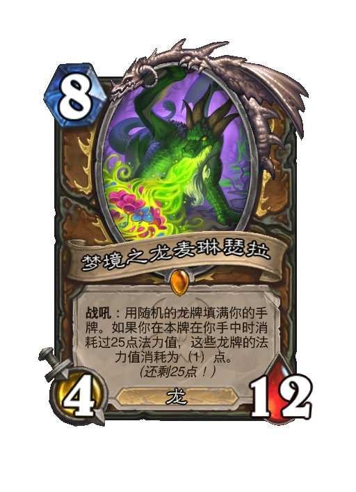 炉石传说 德鲁伊传说随从,8费4/12,龙战吼:用随机的龙牌填满你的手牌。如果你