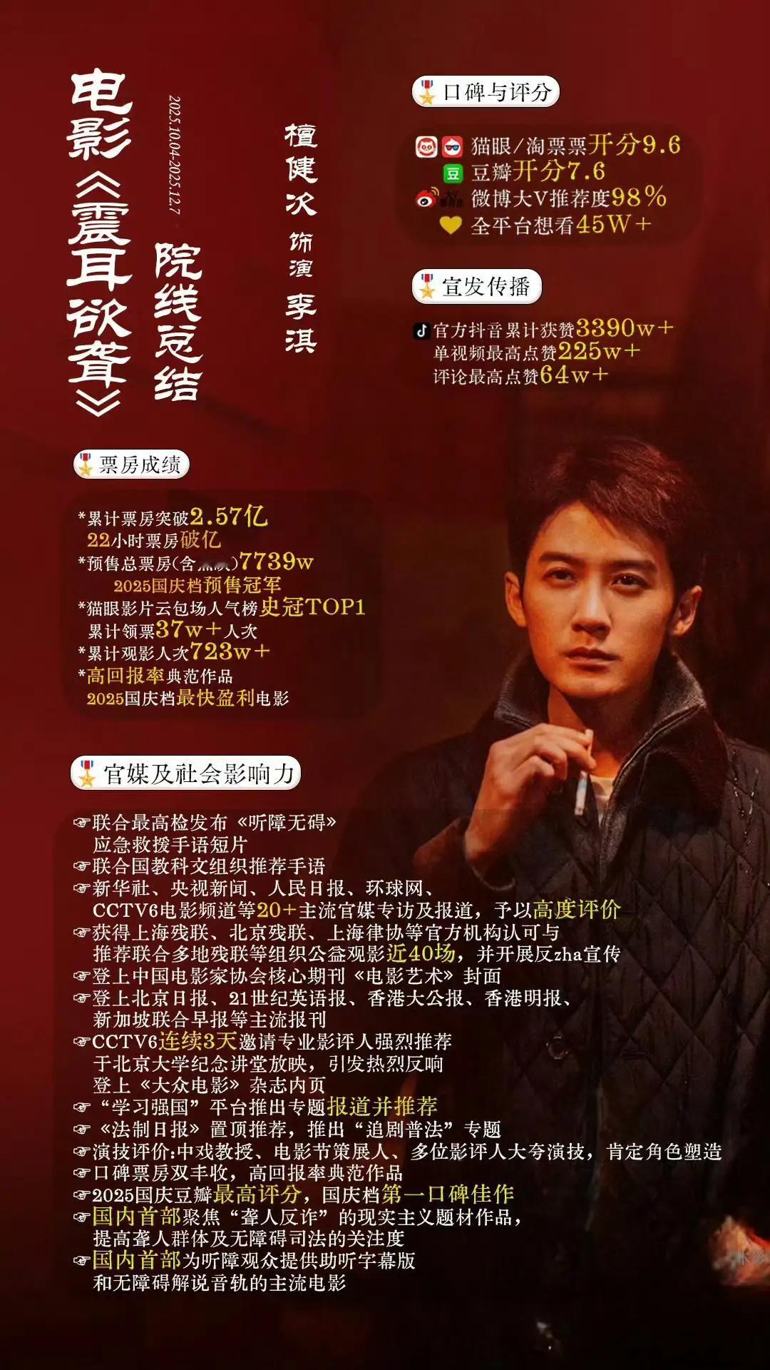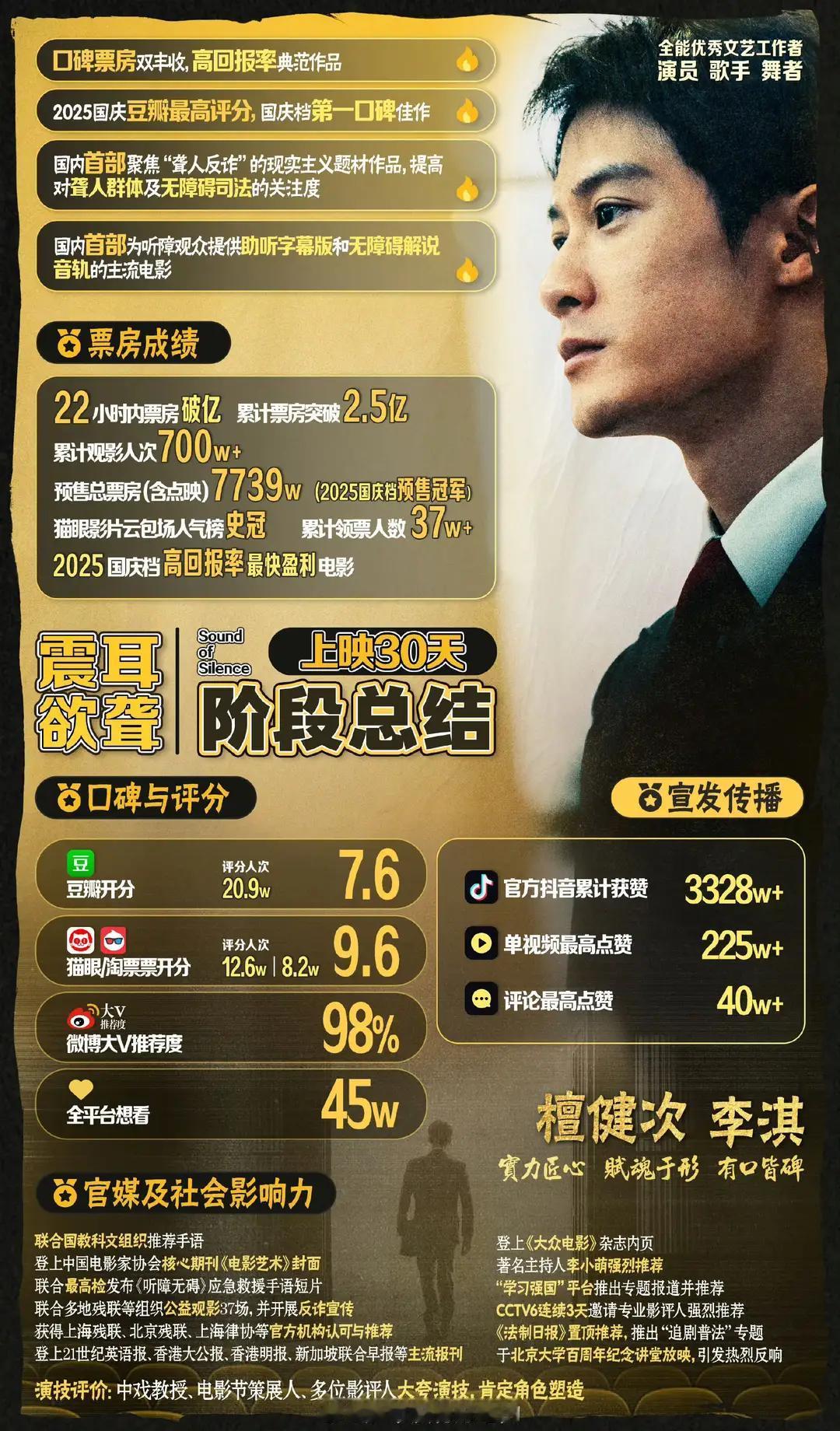可不许拿我们《震耳欲聋》共沉沦,震耳欲聋预售加点映7800万!众所周知点映无路人!现在看看檀健次的两部电影才是真正的单抗啊! 《震耳欲聋》今年国庆临时冲档,才杀青半年,连开预售也是当天发行下来立刻中午开预售,4号才上映的!上映几乎都是排片比票房占比低的! 更牛的是,檀健次这部不是其他流量的名导演,大IP,或者题材主流,配角很多大腕,带特效的。纯纯新人导演,剧情片,檀健次大男主扛起百分之七十的戏份! 真正的小成本电影,新人导演,无大咖加持,也没有题材红利,没有强班底,基本是檀健次一个人单扛,没有任何外力! 作为国内首部聚焦聋人反诈的现实题材电影,《震耳欲聋》不仅以7739w预售登顶国庆档冠军,更创下22小时票房破亿、累计2.57亿的佳绩,登顶猫眼云包场人气榜,成为档期最快盈利的高回报率典范! 而背后核心驱动力,正是檀健次的表演颠覆与个人影响力,他可以让小众题材走进大众视野,用演技为影片注入了破圈的能量。 作为中小成本作品,《震耳欲聋》选择了最不讨巧的现实主义赛道,聚焦听障群体反诈边缘题材,既无豪华班底加持,也无大场面特效支撑。 在商业大片扎堆的国庆档,这类聚焦小众群体困境的影片往往难逃叫好不叫座的宿命,而该片最终斩获2.57亿票房,成为档期唯一盈利的真人电影,这份突围堪称不小的黑马。 这部电影靠粉丝口口相传,电影院海报易拉罐都没有,别的一号上的啥都有,就《震耳欲聋》啥都没有! 《震耳欲聋》是我第一次看檀健次演电影,感觉这条路很适合他,路演时人也很谦和,完全没有架子,并且尽可能把前辈的功劳放在前边,难怪粉丝缘、路人缘都不错! 檀健次塑造的李淇更获中戏教授、影评人一致盛赞,演技实力认证!五大流媒体已解锁,速来品鉴这部口碑票房双丰收的佳作! 檀健次是内娱稀有的实力和热度并存的优秀演员,震耳欲聋中的李淇律师被他诠释得非常落地立体鲜活,期待好演员檀健次更多的电影和电视剧作品。