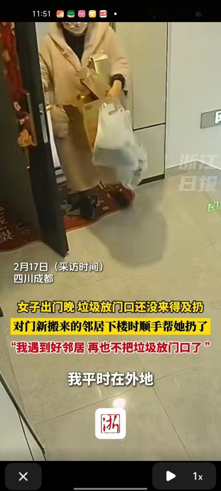 2月15日,四川成都。女子出门晚就放假回家住,垃圾放门口没来得及扔,对门新搬来的邻居下楼时顺手帮她扔了。当事人陈女士称,当时心里很感动也很温暖,第一反应就是以后再也不会把垃圾放门口了