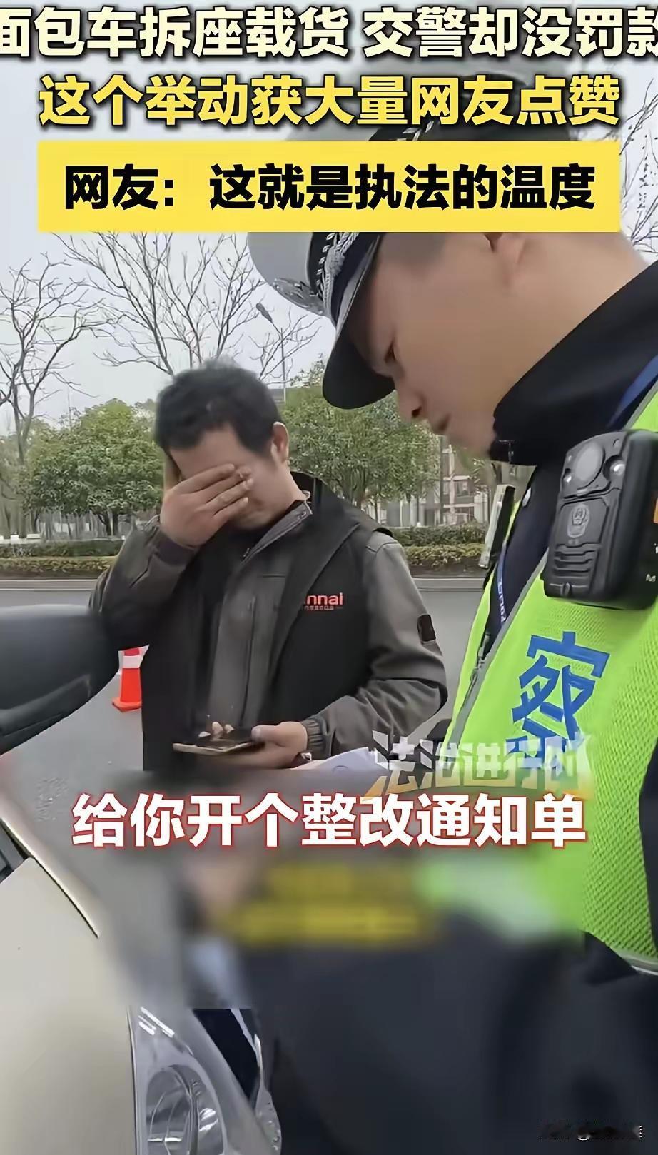 感动!春节期间交警查车,遇到一辆为了多拉货拆掉座椅的面包车,车主下车后满脸堆笑,试探性的问交警能不能少罚点,交警没有搭话,准备开具罚单,随口问了一句:“过年怎么还在拉货?”司机回答:自己三个小孩,老父亲还患有癌症,自己又没有什么技术,由于过年期间拉货的少,多干点,就能多挣点。交警听到这,放下了手中的罚单,对司机说到:今天只给你开具整改通知书,罚单就免了回去之后把座椅装上,不能私自改装车辆。司机感激的连连点头!这位交警在得知司机还没有吃饭后,又把他带到岗亭给他泡了一碗面。网友说:这才是有温度的执法! 这一幕真实发生在湖南长沙春运执勤现场,没有刻意编排,却在春节期间打动了无数普通人。万家团圆的日子里,多数人都在享受假期,这位司机却不敢休息。他清楚拆座椅拉货属于交通违法行为,也知道被查到会面临处罚,可生活的重担没有给他选择的余地。 三个孩子要抚养,患病的父亲需要持续治疗,他没有稳定工作,也没有专业技术,只能靠面包车拉货维持全家开支。春节期间货运需求集中,愿意出车的人不多,他想多跑几单,多挣一点收入,每一分钱都要用来支撑家庭开销。他下车后赔笑求情,不是耍小聪明,是真的无力承担额外罚款,这笔钱对他来说,是家人的医药费,是孩子的生活费。 按照道路交通安全相关规定,擅自拆除面包车座椅属于改变车辆登记结构,交警依法罚款、责令整改完全合规。这位交警没有直接开具罚单,他选择先听完司机的全部难处。他放弃罚款,不是无视规则,是在法律赋予的自由裁量权内,做出更贴合民生的选择。开具整改通知书,明确要求恢复车辆原状,是坚守安全底线,提醒司机违规改装会带来行车隐患,这是对生命安全的负责。 把司机带进岗亭泡一碗热面,是最朴素也最动人的善意。春节的室外气温很低,司机连续奔波,连一口热饭都没吃上。一碗泡面不值多少钱,却能让疲惫的中年人感受到被理解、被尊重。交警没有说太多安慰的话,这个小动作,比任何语言都更有力量,也让执法者的形象变得更有温度。 网友的点赞与认可,从来不是因为纵容违法,而是认可执法的分寸感。规则是社会运行的底线,不能突破。人情是社会运转的温度,不能缺失。以往部分执法过于生硬,容易引发对立情绪。这次处理方式,既指出了违法行为与安全风险,又体谅了当事人的实际困境,让司机主动认错、愿意整改,实现了法律效果与社会效果的统一。 我们身边有很多这样的底层劳动者,他们本分、勤劳,为了家人咬牙坚持。他们会因生活压力出现轻微违法,但没有主观恶意,更没有危害社会。面对这样的群体,执法者多一句询问,多一份观察,多一次人性化处理,就能减轻一个家庭的压力,传递一份社会的善意。 柔性执法的核心,是执法为民。法律的最终目的不是处罚,是维护秩序、保护安全、守护民生。这位交警用行动证明,执法可以有力度,更可以有温度。 各位读者你们怎么看?欢迎在评论区讨论。
