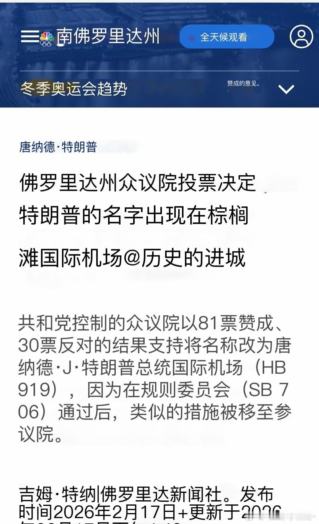 佛罗里达州众议院昨天以81比30投票结果通过将棕榈滩国际机场更名为“唐纳德·特朗