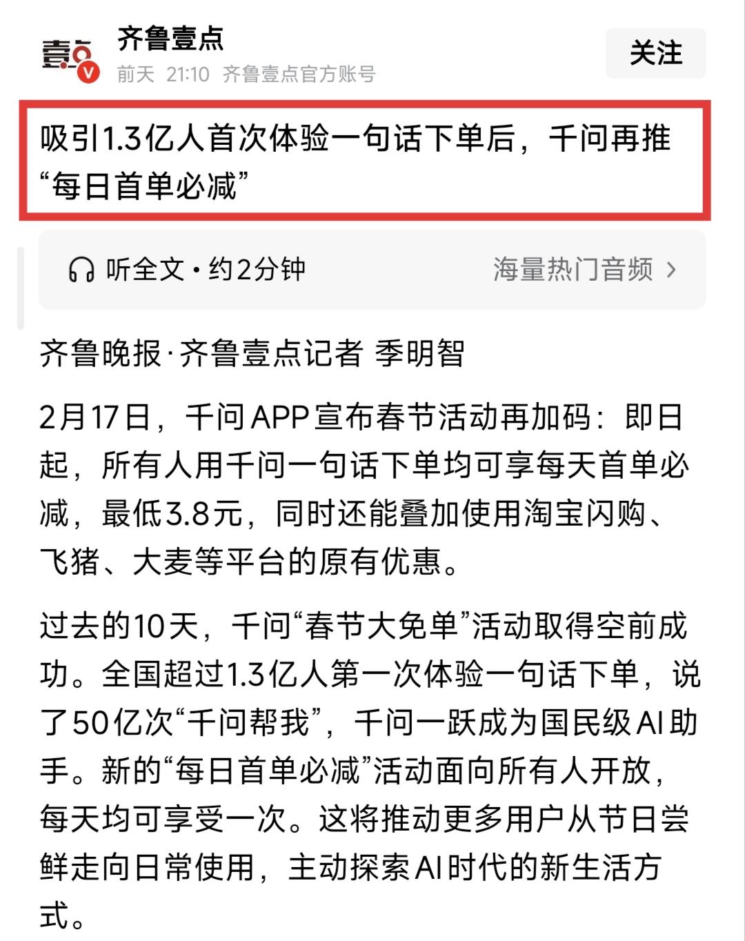 一句话搞定吃喝玩乐,千问凭啥在春节刷屏?看完底层逻辑就懂了! 今年春节AI圈最火的,非千问莫属。2月初上线的春节大免单直接引爆热潮,用户动动嘴,订餐饮、买年货、抢电影票、订景区门票全搞定,AI彻底从“聊天玩具”变成生活刚需。 数据说明一切,就在千问开启春节大免单活动期间,超1.3亿人首次体验AI下单,累计发出50亿次“千问帮我”,妥妥的国民级AI助手。 而这一切还没结束,从2月17日起,千问推出每日首单随机立减,每天第一笔订单必减,最低3.8元起,看到不少人领到了8.8元,一杯奶茶、一顿早餐直接省下来。 更关键的是,千问立减可与淘宝闪购、飞猪、大麦等平台原有优惠叠加,让用户得到最大的实惠。 至于千问为什么能快速破圈,其实底层逻辑很清晰:AI落地的核心,是实用与普惠。 说白了,千问没有停留在技术炫技,而是瞄准生活刚需,用极简的交互方式降低使用门槛,再搭配真金白银的福利降低体验成本,精准击中用户“怕麻烦、想省钱”的核心需求。 可以说,千问这波操作简洁、透明、接地气,让AI从概念变成可用、好用的日常工具。这种贴近生活、回归用户的思路,也正是AI生活化方式普及的关键一步。