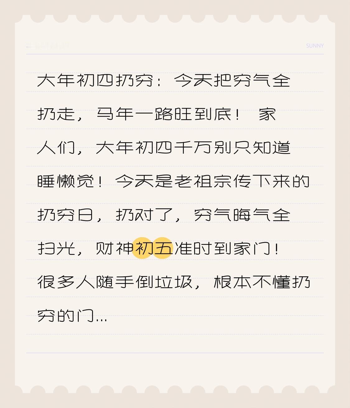 大年初四扔穷:今天把穷气全扔走,马年一路旺到底! 家人们,大年初四千万别只知道睡懒觉!今天是老祖宗传下来的扔穷日,扔对了,穷气晦气全扫光,财神初五准时到家门!很多人随手倒垃圾,根本不懂扔穷的门道,难怪一年忙到头,钱留不住、福不进门! 为啥偏偏初四扔穷?老规矩里,初一到初三不动扫帚,怕扫走财气;攒了三天的垃圾、灰尘、旧物,全是藏穷气、霉运的地方。初四迎灶神归位,正好把“穷神”请出门,给福气、财气腾地方,这才是过年最该做的仪式感! 很多人觉得扔穷就是倒垃圾,大错特错!扔穷不是扔东西,是扔烦恼、扔内耗、扔不顺!别只清家里的灰尘,更要清心里的包袱:扔掉去年的委屈、焦虑、烂人烂事;扔掉舍不得的破碗烂碟、过期杂物;扔掉拖延、懒惰、不开心。屋子干净了,心敞亮了,好运自然跟着来! 扔穷也有讲究,记住这3步,财气不流失:上午阳气足,从里往外扫,犄角旮旯都清干净;垃圾装袋,默念“穷气走、福气来”,出门扔掉不回头;扔完别捡路边东西,添件小物件,迎新纳福更旺家! 小时候跟着长辈扔穷,总觉得是老迷信;长大才懂,这是中国人最朴素的盼头。谁不想告别拮据、告别疲惫,新一年顺风顺水?扔穷,扔的是过去的困顿,迎的是未来的希望;清的是家里的尘埃,安的是一家人的心。 2026马年,愿你借着初四扔穷的东风:扔掉所有不如意,迎来富贵与安康;家里干干净净,日子红红火火;家人平安健康,财源滚滚进门。 大年初四,一起扔穷迎富!转发给家人朋友,把穷气扔得远远的,把福气接得满满的,今年咱们都要兜里有钱、心里有光、一路开挂、万事顺遂!