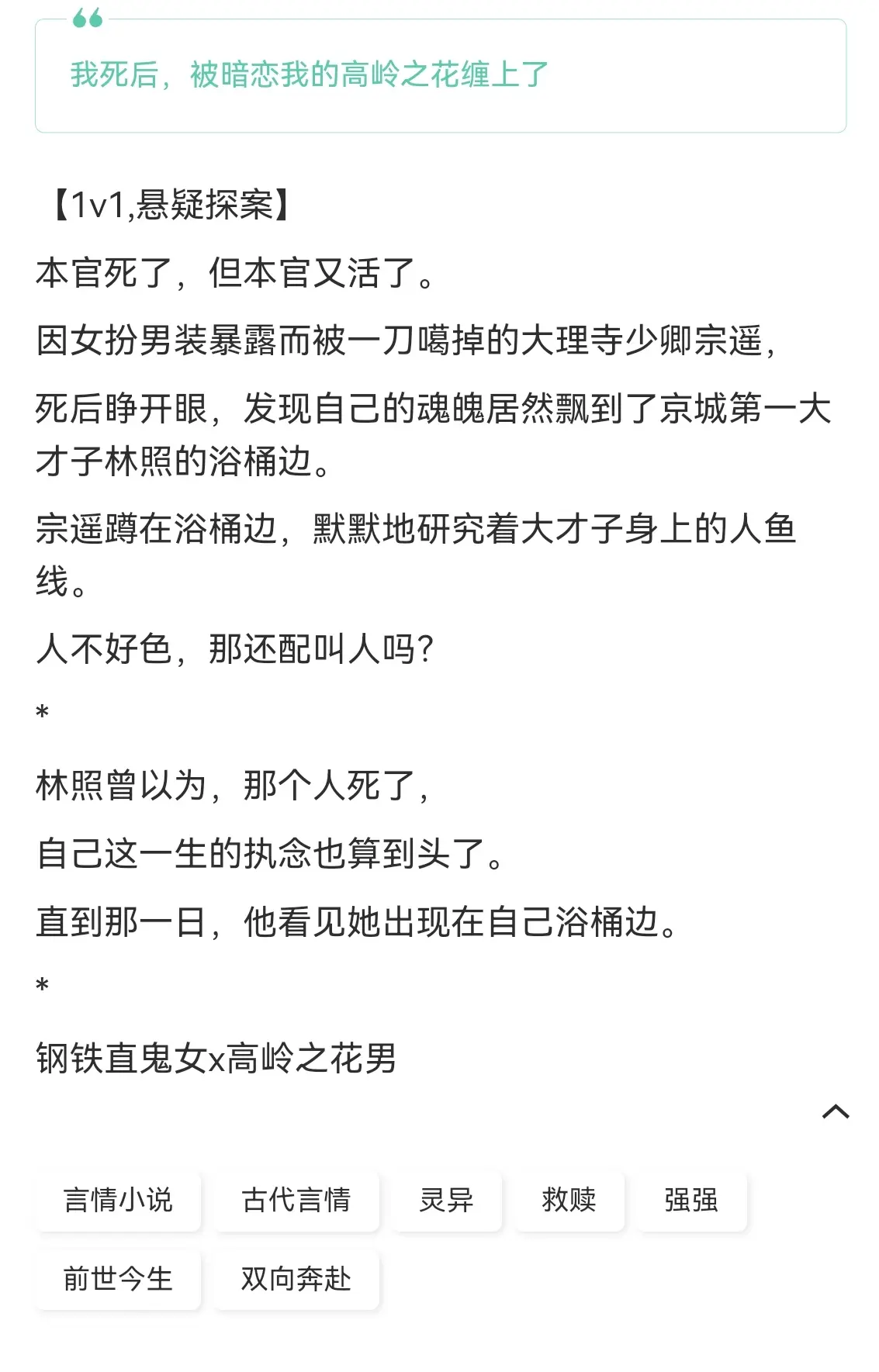 本官死后。豆瓣悬疑探案 【1v1,悬疑探案】 本官死了,但本官又活了。 因女扮男装暴露而被一刀噶掉的大理寺少卿宗遥, 死后睁开眼,发现自己的魂魄居然飘到了京城第一大才子林照的浴桶边。 宗遥蹲在浴桶边,默默地研究着大才子身上的人鱼线。 人不好色,那还配叫人吗? * 林照曾以为,那个人死了, 自己这一生的执念也算到头了。 直到那一日,他看见她出现在自己浴桶边。 钢铁直鬼女x高岭之花男