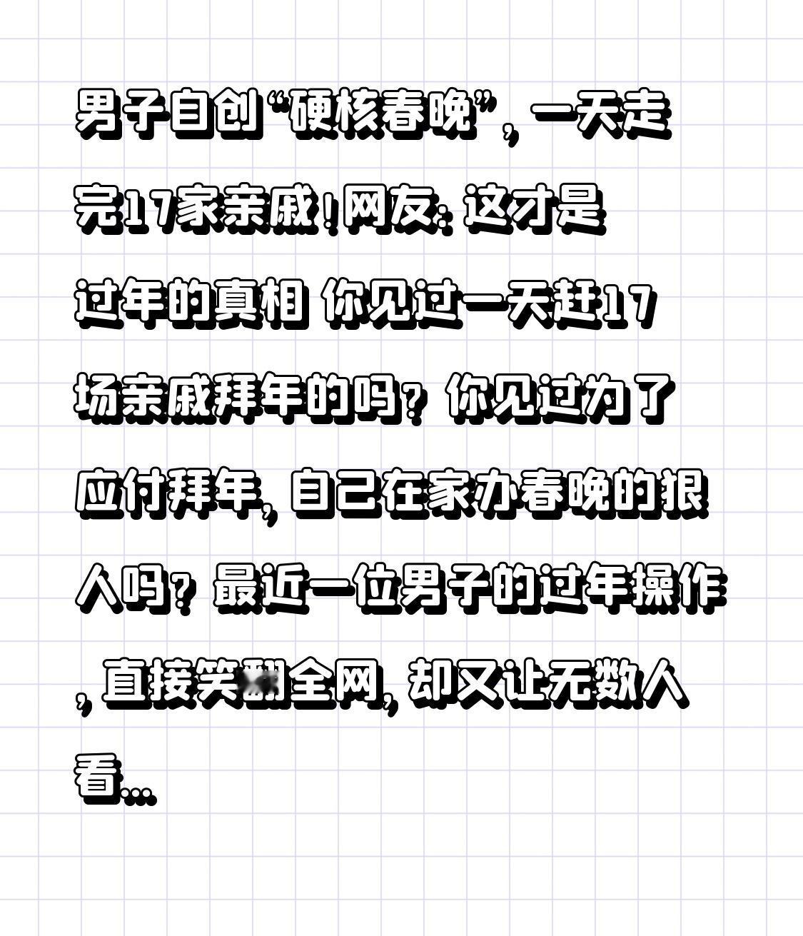男子自创“硬核春晚”,一天走完17家亲戚!网友:这才是过年的真相 你见过一天赶17场亲戚拜年的吗?你见过为了应付拜年,自己在家办春晚的狠人吗?最近一位男子的过年操作,直接笑翻全网,却又让无数人看完红了眼眶。 过年走亲戚,本来是团圆暖心的事,可对很多人来说,简直是春节最大的“任务”。这位男子一合计,自家要拜访的亲戚足足17家,挨家挨户跑,不仅路上折腾,还要重复一样的问候、一样的客套,几天时间全耗在路上。 为了既不失礼数,又能省下时间好好陪家人,他灵机一动:自己办一台“家庭春晚”!他布置简单舞台,准备喜庆音乐,自己主持、自己表演,把所有亲戚请到一起,一场热热闹闹的聚会,直接把17家亲戚的拜年流程一次性走完。 本以为是搞笑操作,没想到现场格外暖心。老人们笑得合不拢嘴,孩子们围在一起热闹非凡,没有来回奔波的疲惫,没有敷衍客套的尴尬,一大家人热热闹闹坐在一起,说说话、聊聊天,年味一下子就回来了。 很多人说,现在的年越来越没味,不是年味淡了,是我们把过年过累了。忙着赶场、忙着送礼、忙着应付各种场面,反而忘了过年的本意,是陪伴、是团圆、是一家人开开心心。 这位男子的做法,看似“偷懒”,实则活明白了。拜年从不是走流程,也不是比谁跑得勤,而是心意到了、温暖到了,比什么都强。用一场热闹的家庭春晚,代替奔波劳累,既尊重了长辈,维系了亲情,也守住了过年最纯粹的快乐。 看完他的故事,很多网友直呼:学到了!这才是过年该有的样子。 新的一年,愿我们都能卸下疲惫,不被世俗绑架,多陪一陪真正在乎的人,把年味过进心里,把团圆过得轻松又温暖。 这样的过年方式,你支持吗?评论区说说你的春节故事!
