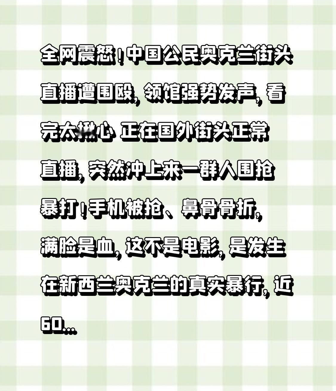 全网震怒!中国公民奥克兰街头直播遭围殴,领馆强势发声,看完太揪心 正在国外街头正常直播,突然冲上来一群人围抢暴打!手机被抢、鼻骨骨折,满脸是血,这不是电影,是发生在新西兰奥克兰的真实暴行,近6000名网友直播间亲眼目睹! 2月14日深夜,华人博主在奥克兰市中心码头直播,十几名青少年假意跳舞靠近,瞬间抢走两部直播手机与背包。他本能追赶,却被引入死角惨遭围殴,倒地呼救无人敢上前,直到警方赶到送医,诊断鼻骨骨折需手术,身上多处挫伤,身心重创。 本以为只是随机治安事件,真相曝光更让人愤怒:歹徒分工明确、佯装友好、突然施暴,专挑独行华人下手。海外打拼本就不易,只是记录生活,却沦为暴力目标,安全感瞬间碎一地。 就在网友心疼又气愤时,关键转折来了!中国驻奥克兰总领馆第一时间重磅发声:高度关切、严正交涉,要求警方依法公正严肃查办,全力保护中国公民安全,已慰问伤者并提供协助。当地警方全力侦办,正义绝不缺席。 无数华人刷屏:祖国永远是最硬靠山!出门在外,平安比什么都重要。近年来海外针对华人的偷袭、抢劫时有发生,深夜外出、街头直播、独自行动,都可能暗藏危险。 这一幕给所有海外同胞敲醒警钟:低调出行、远离偏僻路段、不与陌生人纠缠、遇危险先自保再报警,第一时间联系使领馆。我们不惹事,但绝不怕事,同胞受辱,举国关注;华人安全,底线不容侵犯。 无论走多远,身后都有强大祖国。愿受害者早日康复,歹徒严惩不贷,愿每一位游子在外都能平安顺遂、有尊严、有保障。 你在外遇到过不安全情况吗?支持严惩施暴者吗?评论区为同胞祈福,为祖国底气点赞!